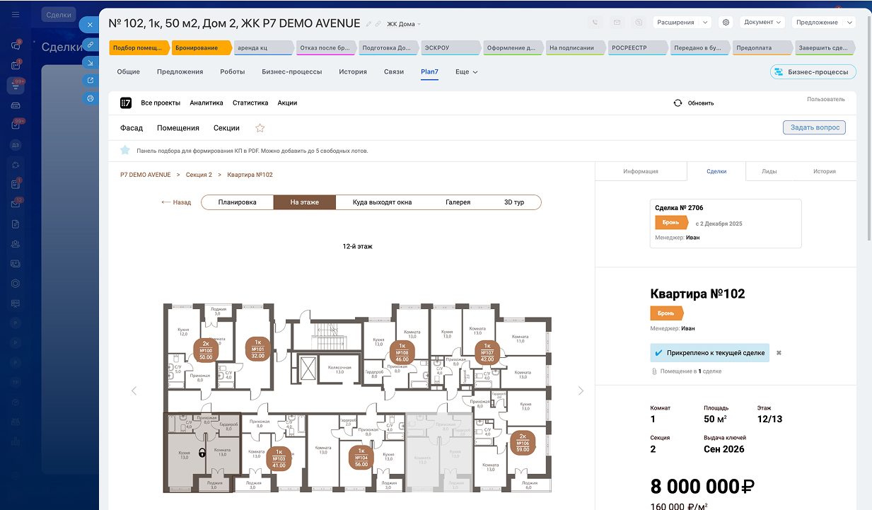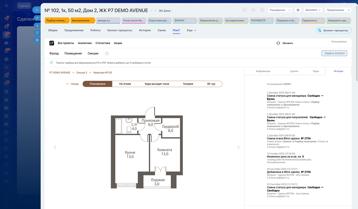- автообновление статуса квартиры в зависимости от этапа воронки