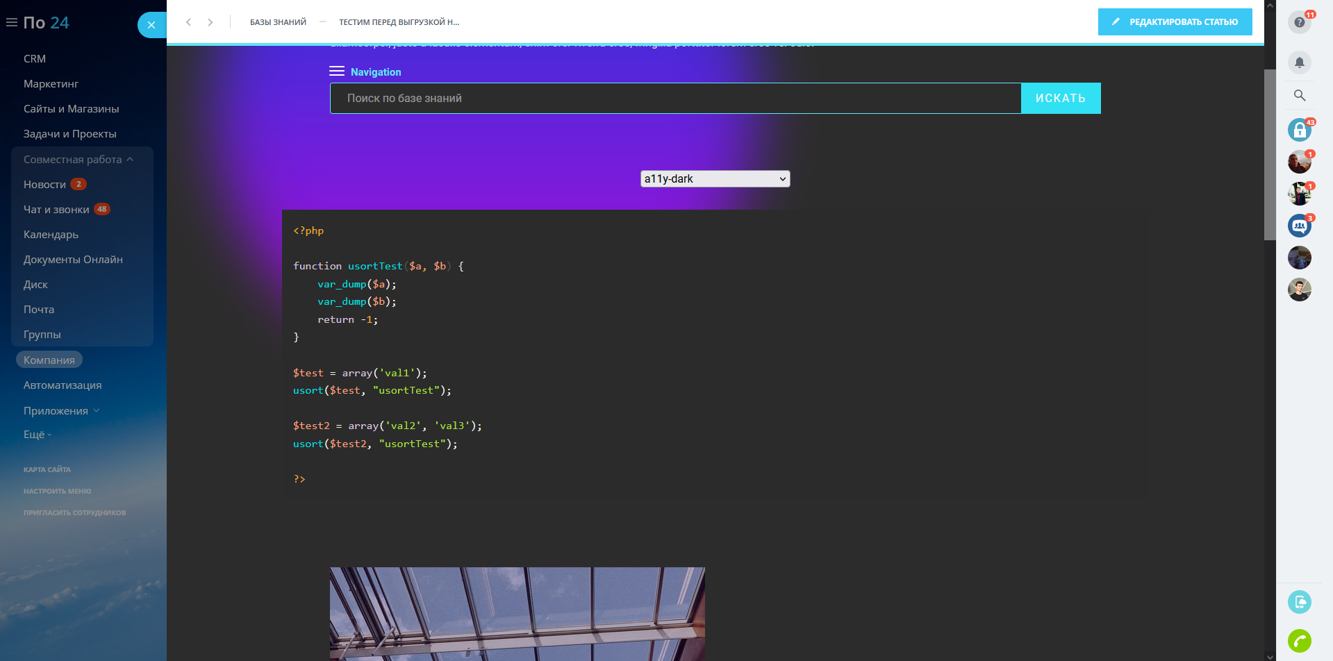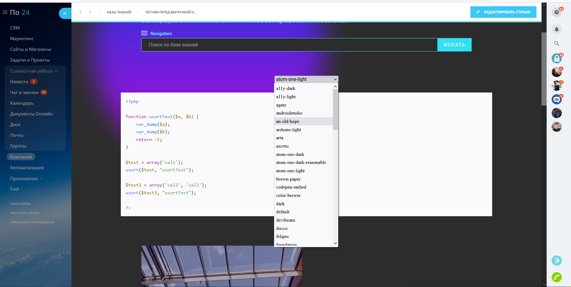 Блок кода базы знаний и сайтов