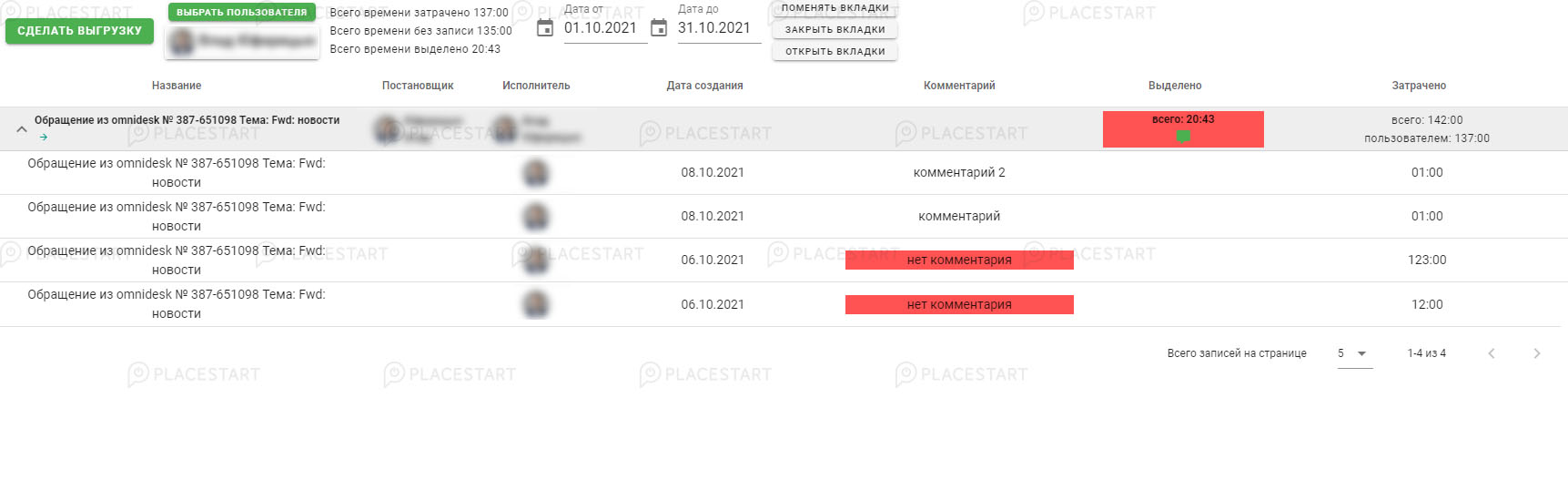 Отчет выводит статистику по выделенному и затраченному времени по задачам в выбранном промежутке дат.