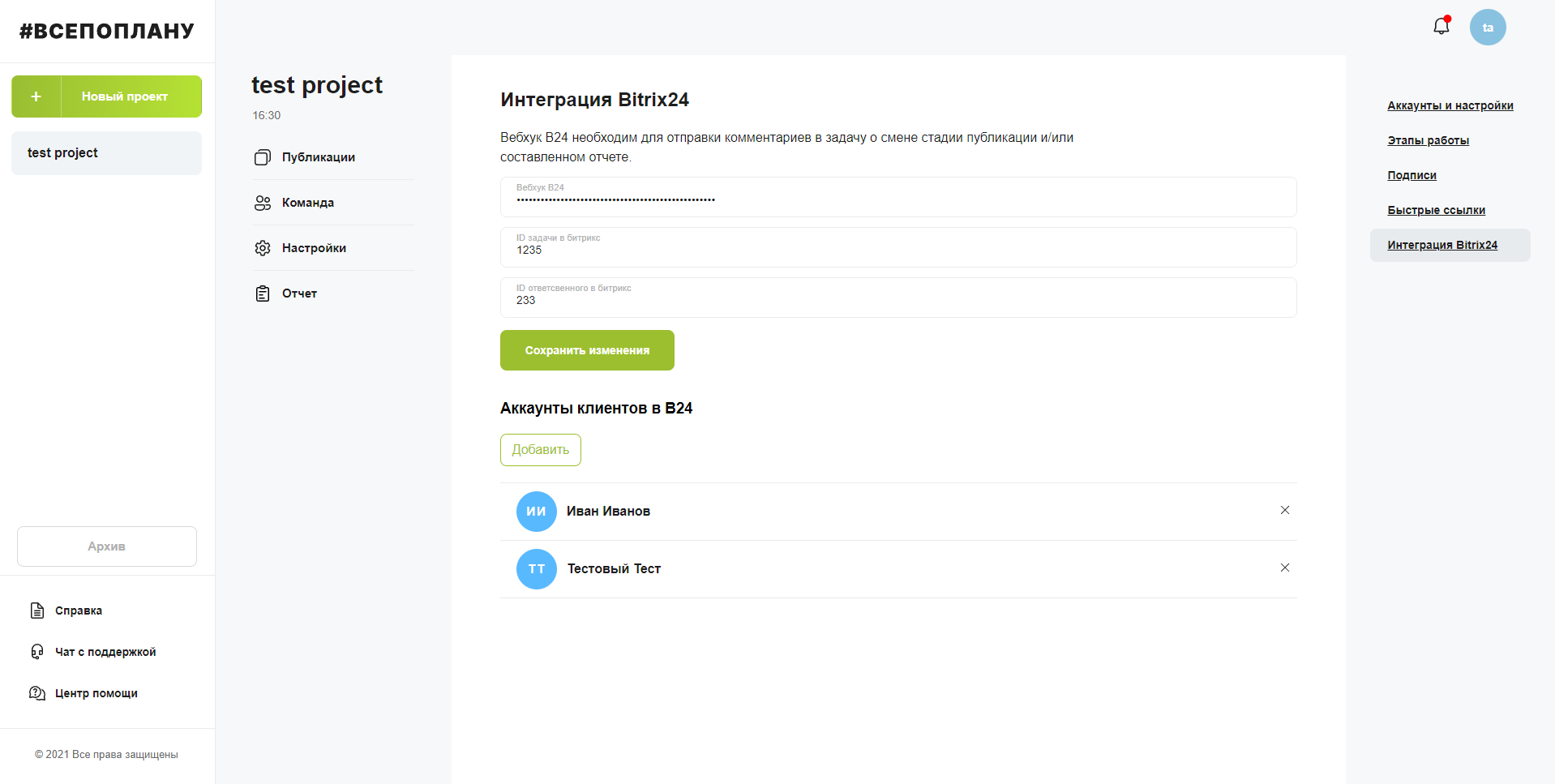 Функционал интеграции заключается в том, что в сервисе #ВсеПоПлану к конкретному SMM проекту привязывается bitrix24 вебхук позволяющий добавлять к проекту конкретных пользователей из b24 (давать доступ для согласования), а так же отправлять в комментарии к задачам b24 уведомления о смене стадии публикации и/или составленном отчете. Для отправки комментариев в задачу так же необходимо указать ее id на портале и включить функцию отправки уведомлений о смене этапа в настройках этапов работы (Настройки -> Этапы работы -> В нужном этапе ставим галочку "Уведомление в битрикс"). Пользователи портала при открытии приложения имеют доступ к проектам в которые их пригласили используя функционал сервиса. В интерфейсе приложения пользователь имеет возможность просматривать готовящиеся публикации, оставлять комментарии к ним, а так же согласовывать их публикацию прямо из интерфейса bitrix24.