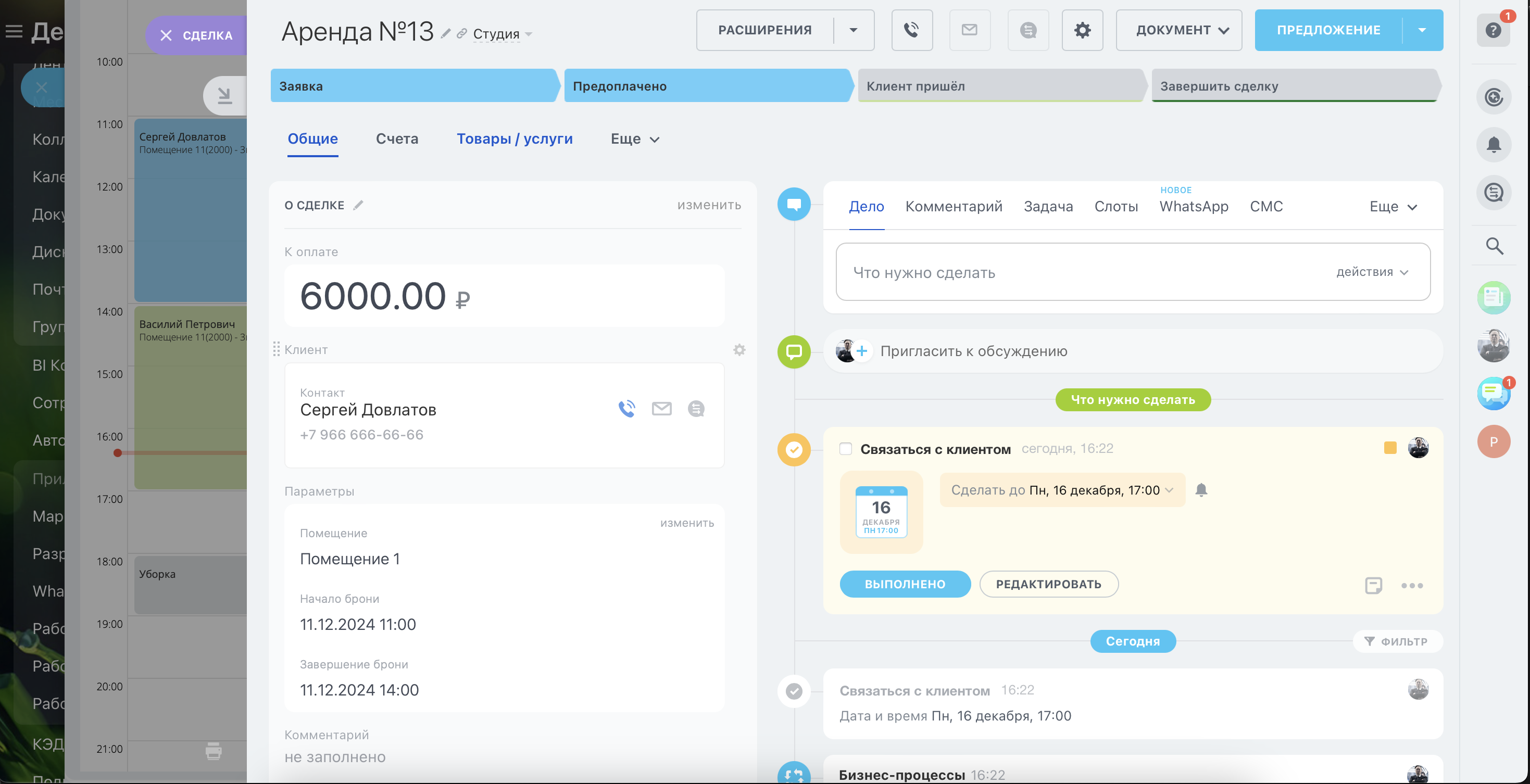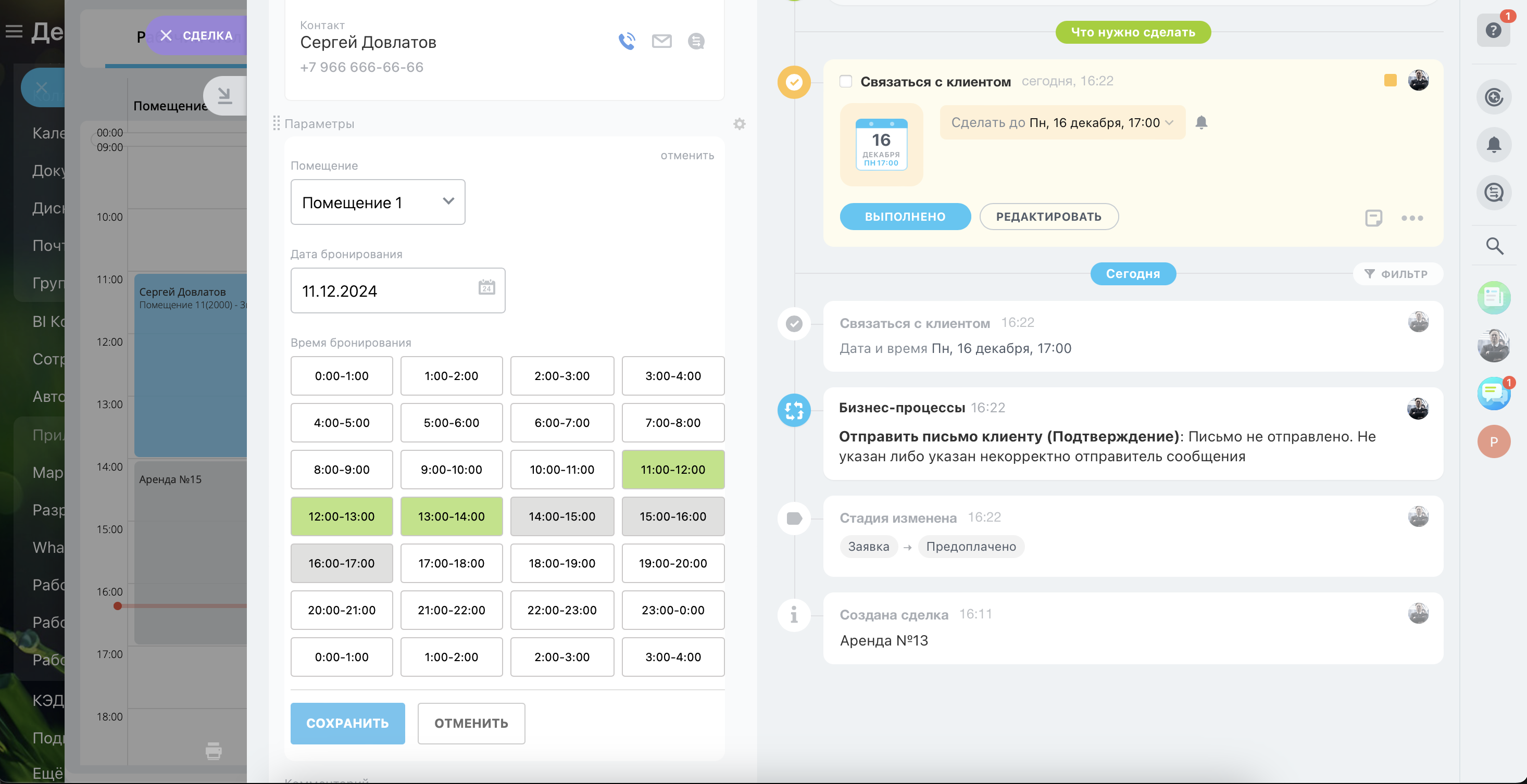 Бронирование интегрировано в карточку сделки- Контакты, история взаимодействия, параметры брони — все в одном месте.