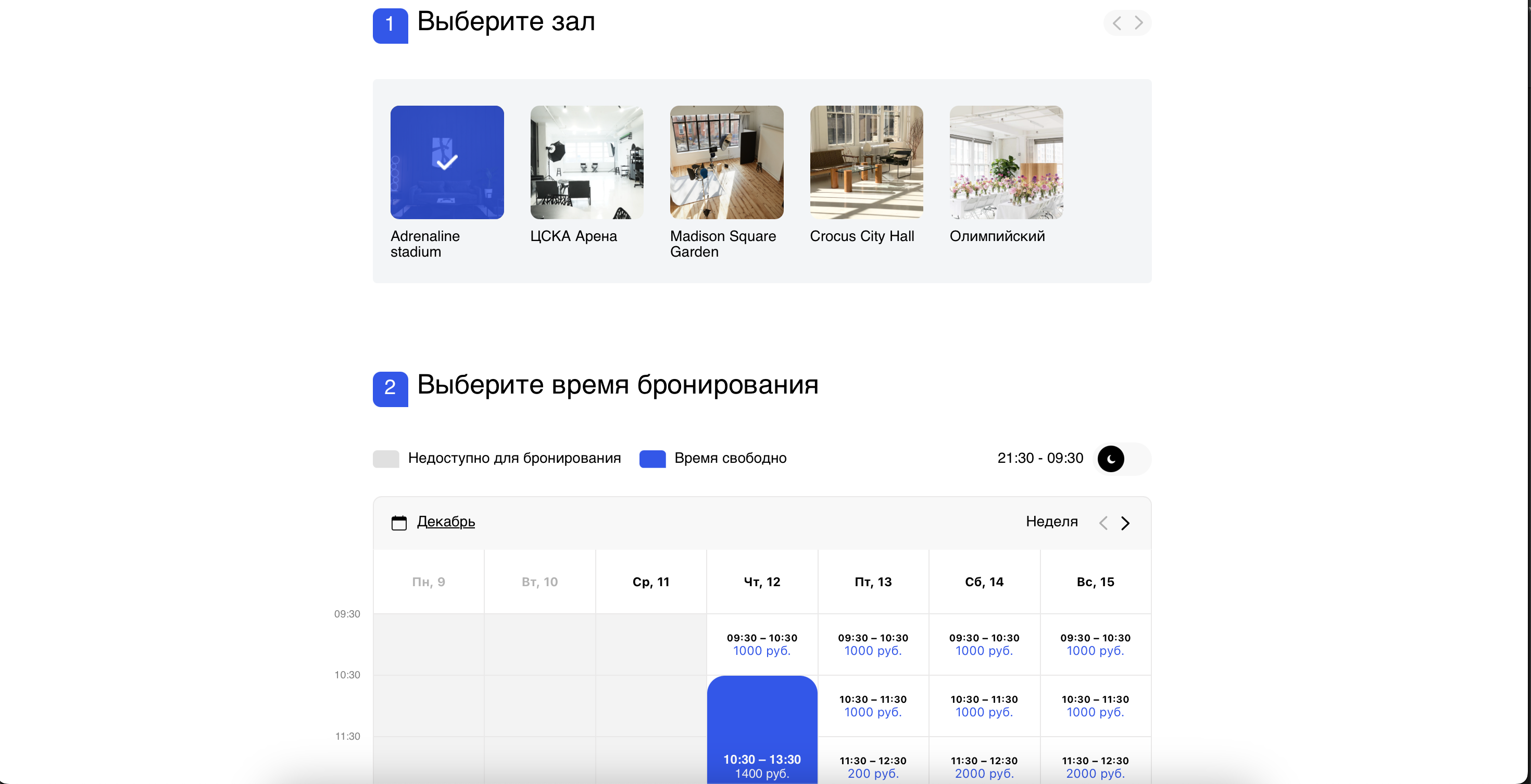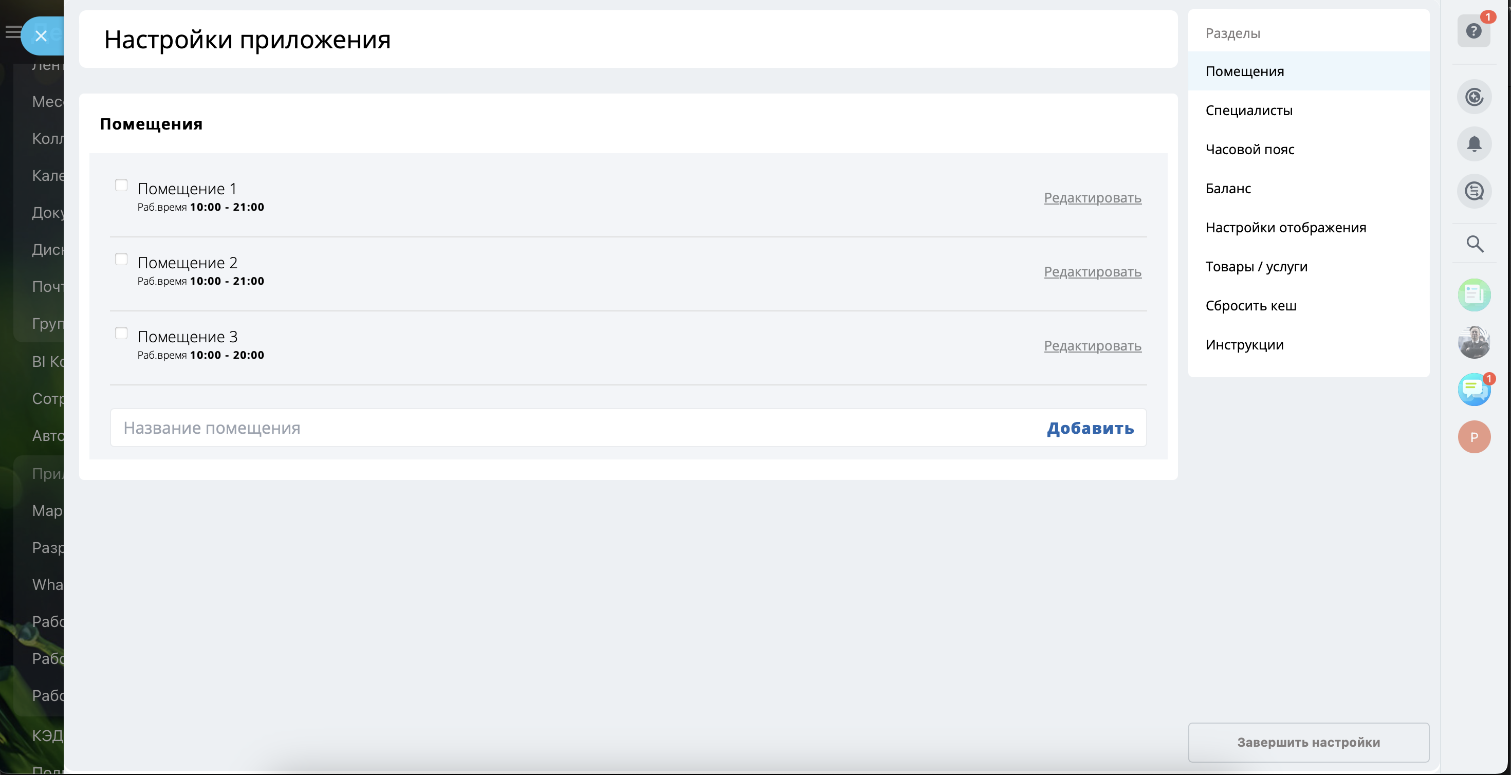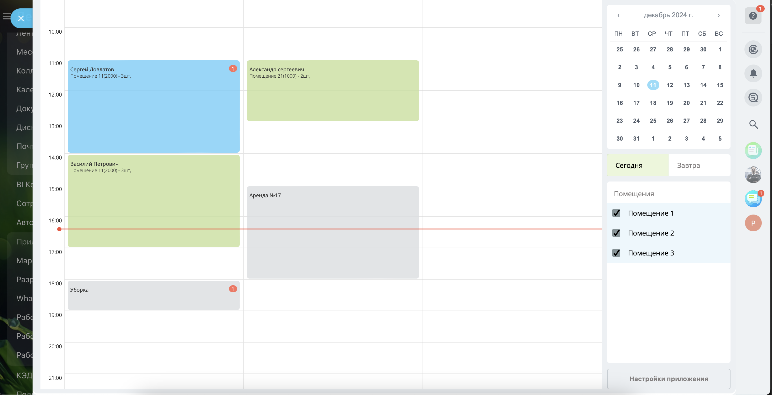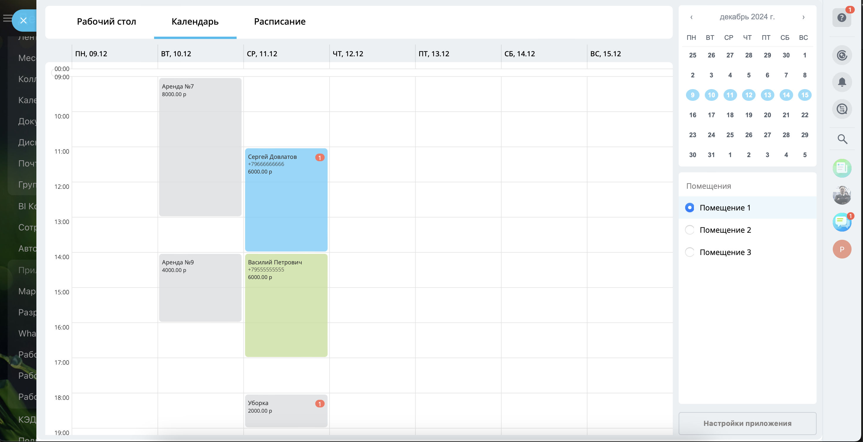 Рабочее место — это ваш центр управления бронированием. Здесь вы увидите все текущие брони, разнесенные по времени и помещениям. Календарь бронирования помогает быстро найти нужный слот и внести новые записи. Также система напоминает о делах и обязательных процедурах для каждого клиента.