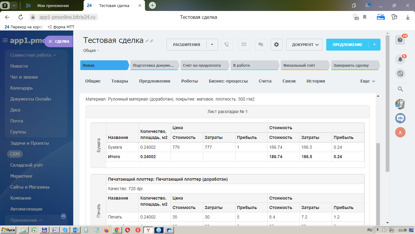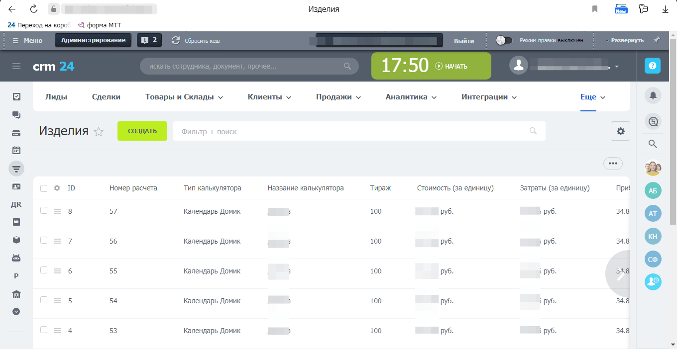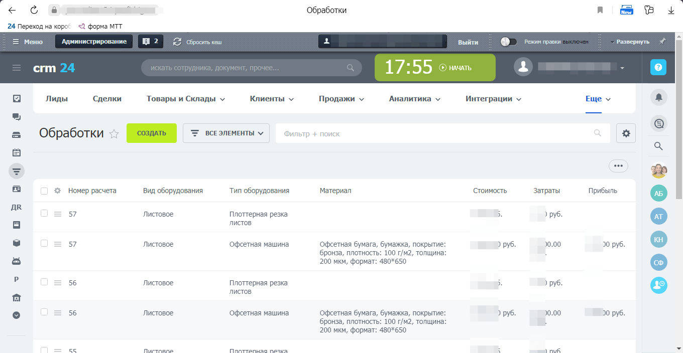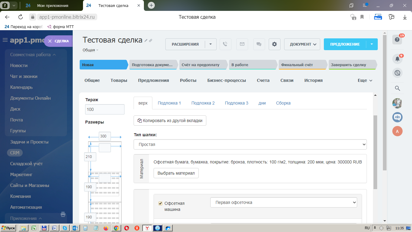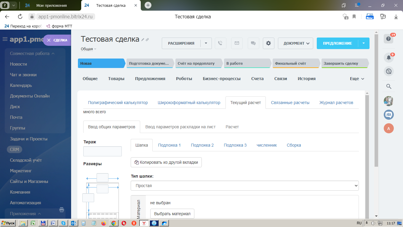 Использование «Битрикс24» в совокупности с сервисом «ПринтМенеджер» обеспечит для вашей типографии возможности по автоматизации бизнес-процессов отдела продаж и производственного блока. Также Вы сможете создать неограниченное число встраиваемых калькуляторов для вашего сайта.