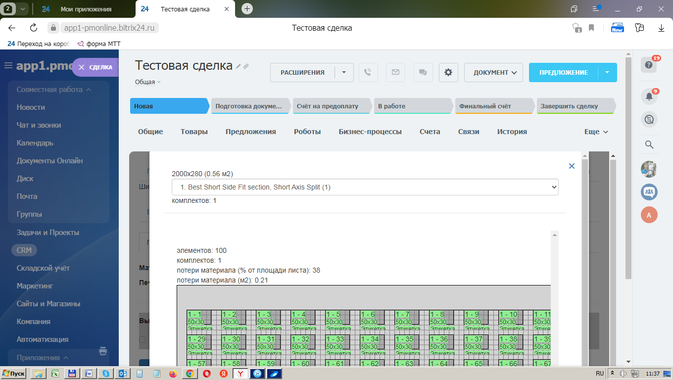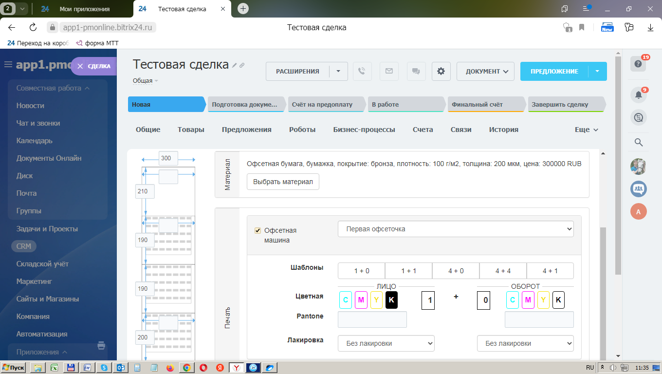 Модуль разработан для типографий. Он позволяет подключить CRM «Битрикс24» (коробку или облако) к онлайн-сервису «ПринтМенеджер», для: 1) Точных расчетов полиграфической продукции в CRM, из Лидов или Сделок. 2) Передачи результатов расчетов в смарт-процессы CRM.