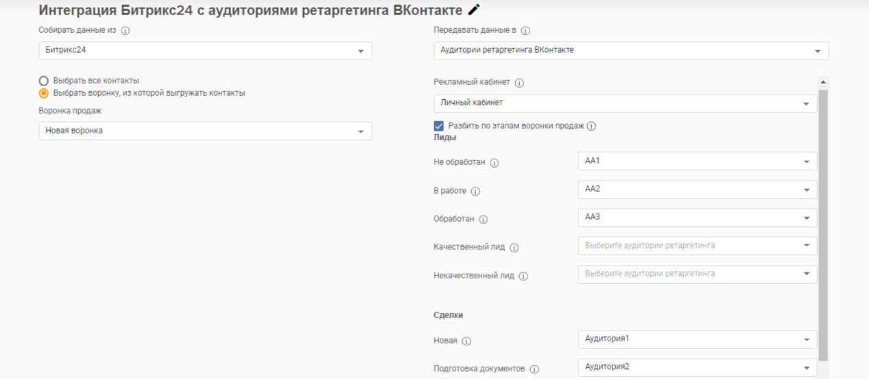 Автоматически выгружайте данные о клиентах из Битрикс24 в аудитории ремаркетинга соцсетей. А также автоматически собирайте данные из лид-форм соцсетей и передавайте их в Битрикс24.