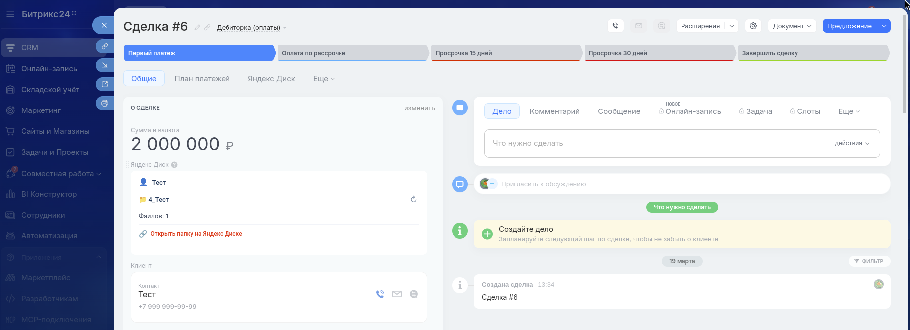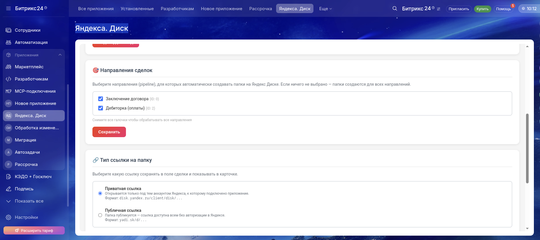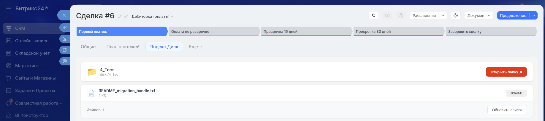 Приложение связывает Bitrix24 CRM с Яндекс.Диском: при создании сделки автоматически создаётся папка, названная по Ф.И.О привязанного контакта. Ссылка сохраняется в поле сделки и отображается в отдельной вкладке карточки.