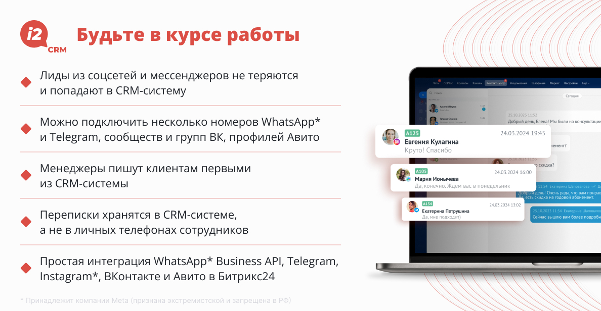 Не терять лиды. i2crm автоматически передает сообщения и комментарии клиентов из WhatsApp, Telegram, ВКонтакте, Instagram* и Авито в Битрикс24, где создаются отдельные сделки. CRM-система мгновенно уведомляет о новых обращениях.