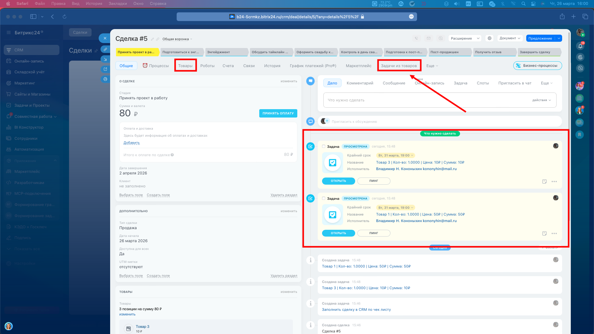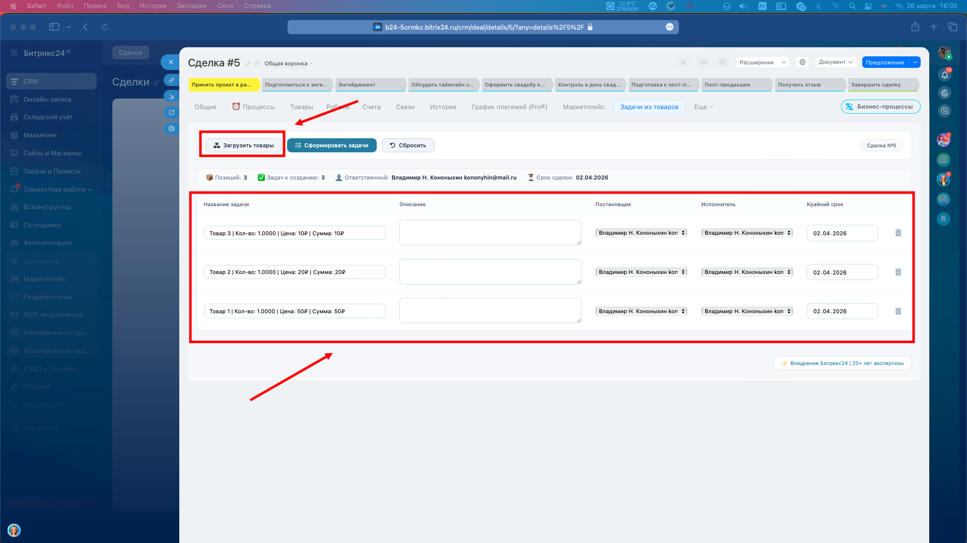 Приложение позволяет для каждого товара, который внесен в сделку сформировать задачу. Иногда требуется произвести закупку конкретной позиции или отследить оказание услуги.