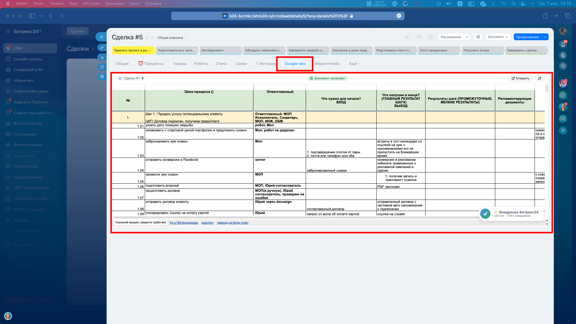 Просмотр Google-документов из сделки