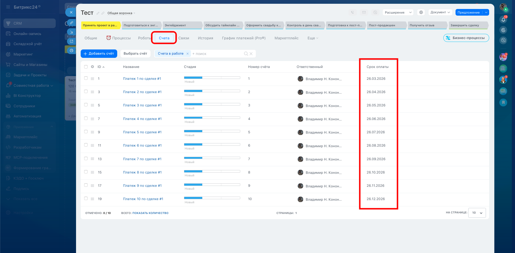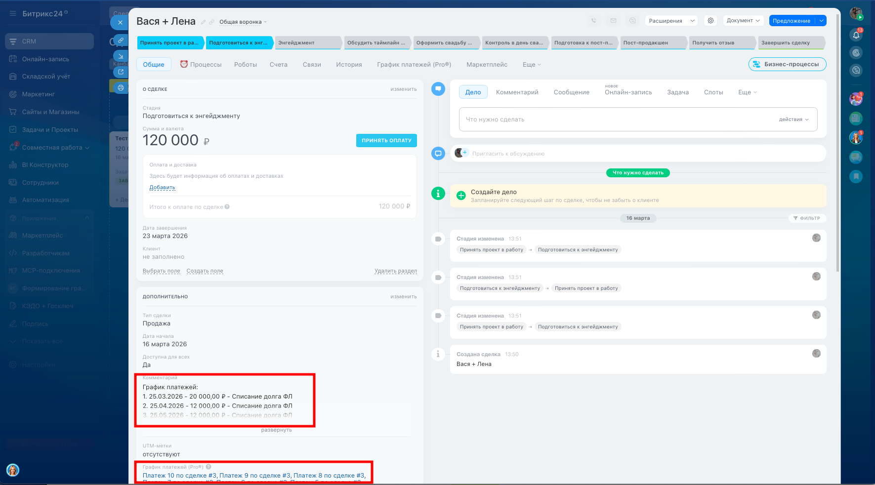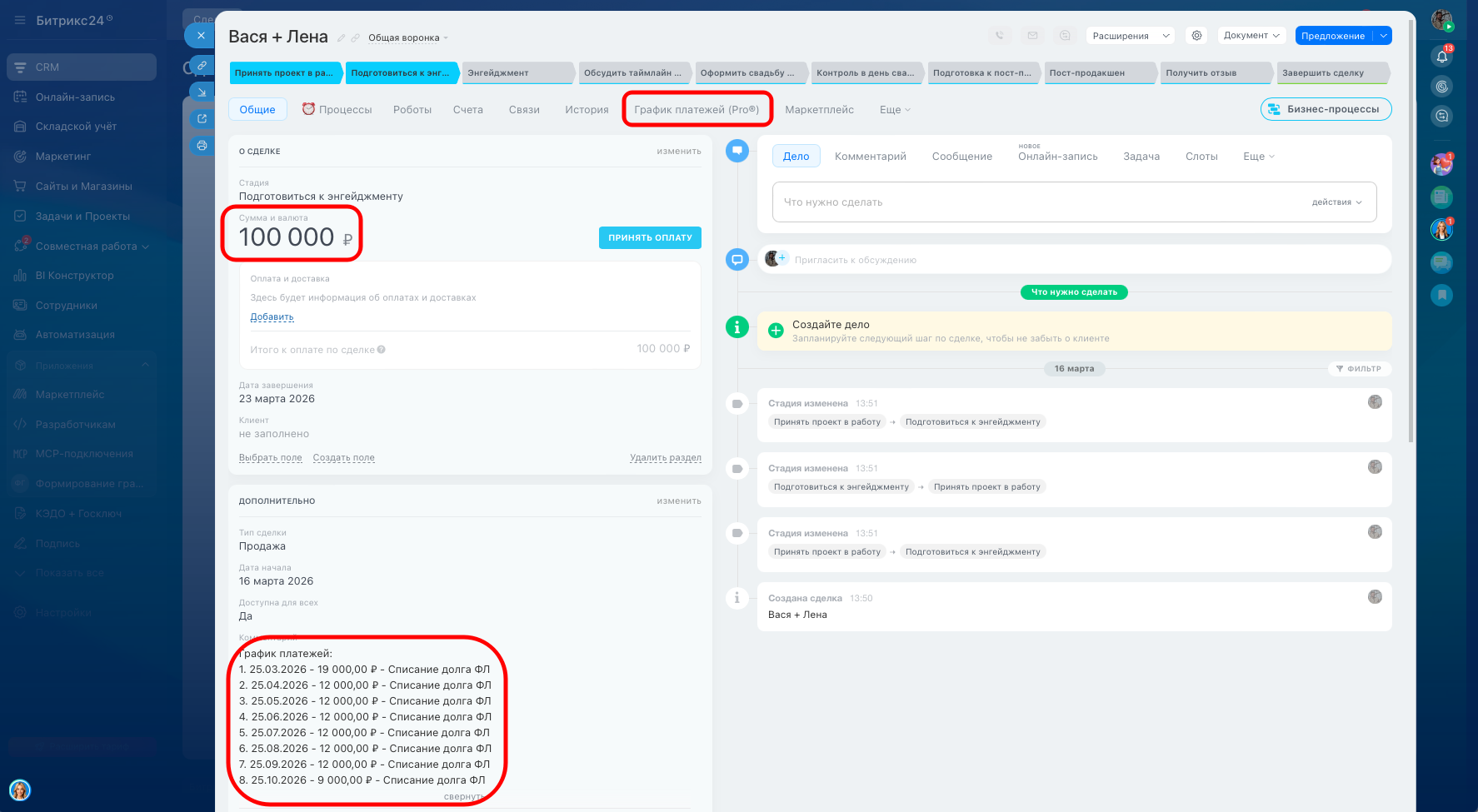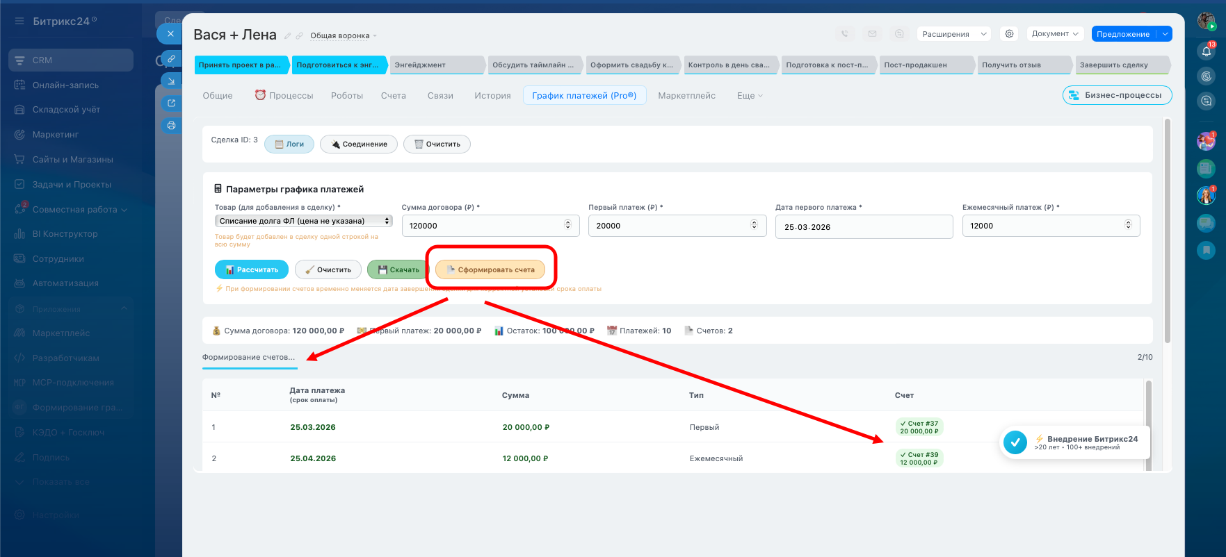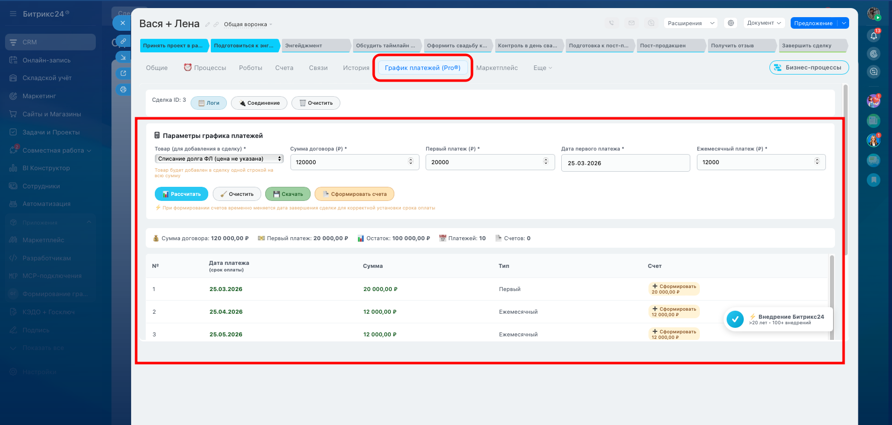 Приложение формирует график платежей исходя из суммы договора, суммы первого платежа и суммы ежемесячного платежа. По факту отработки приложения в сделке заполняется сумма сделке, которая равна сумме договора, в товары добавляется товарная позиция, выбранная на этапе формирования графика платежей, формируется список счетов согласно графику платежей, в поле сделке складываются ссылки на смарт-процесс «Счета» (для формирования спецификации договора). В поле «Комментарий» вносится текстовая информация по графику платежей (для более простого способа вывести график платежей в договор).