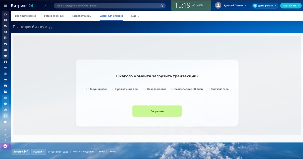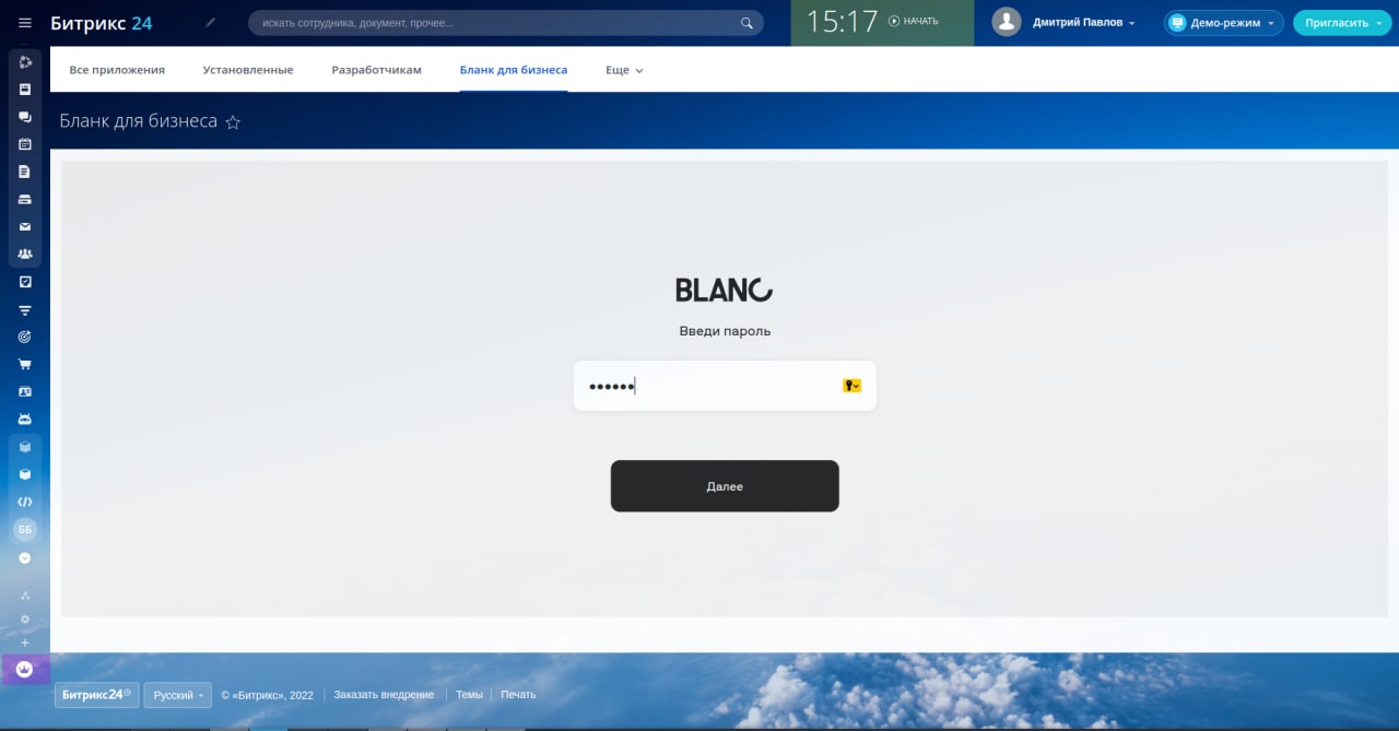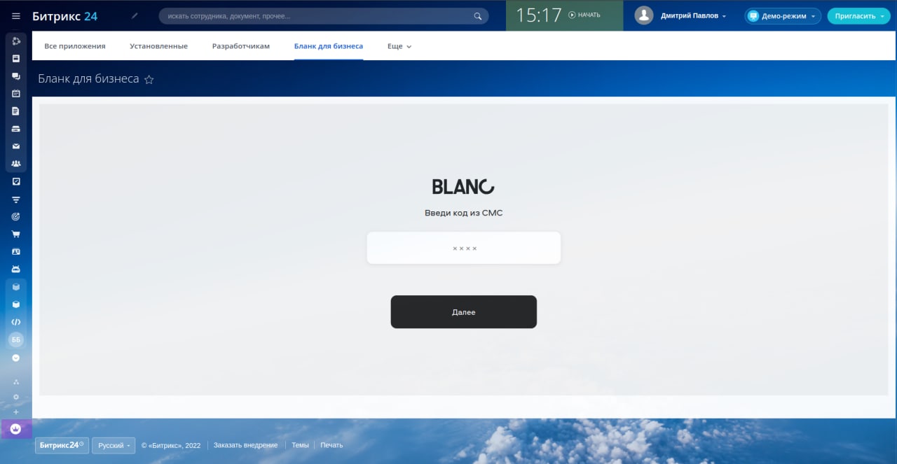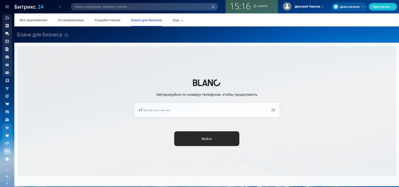 — Достаточно авторизоваться в Битрикс24 и через вкладку «Приложения» подключиться к Бланку.