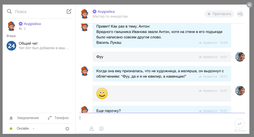 После установки приложения Андрейка обязательно поприветствует собеседника. Напишите ему лично - и он начнет острить, выстраивать с вами уникальный шуточный диалог :)