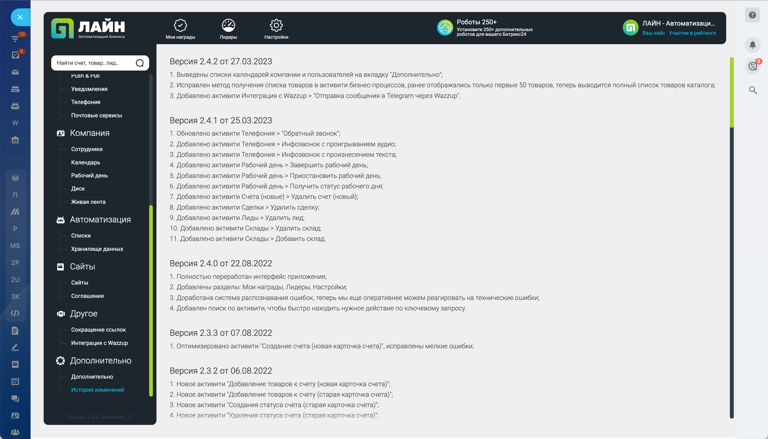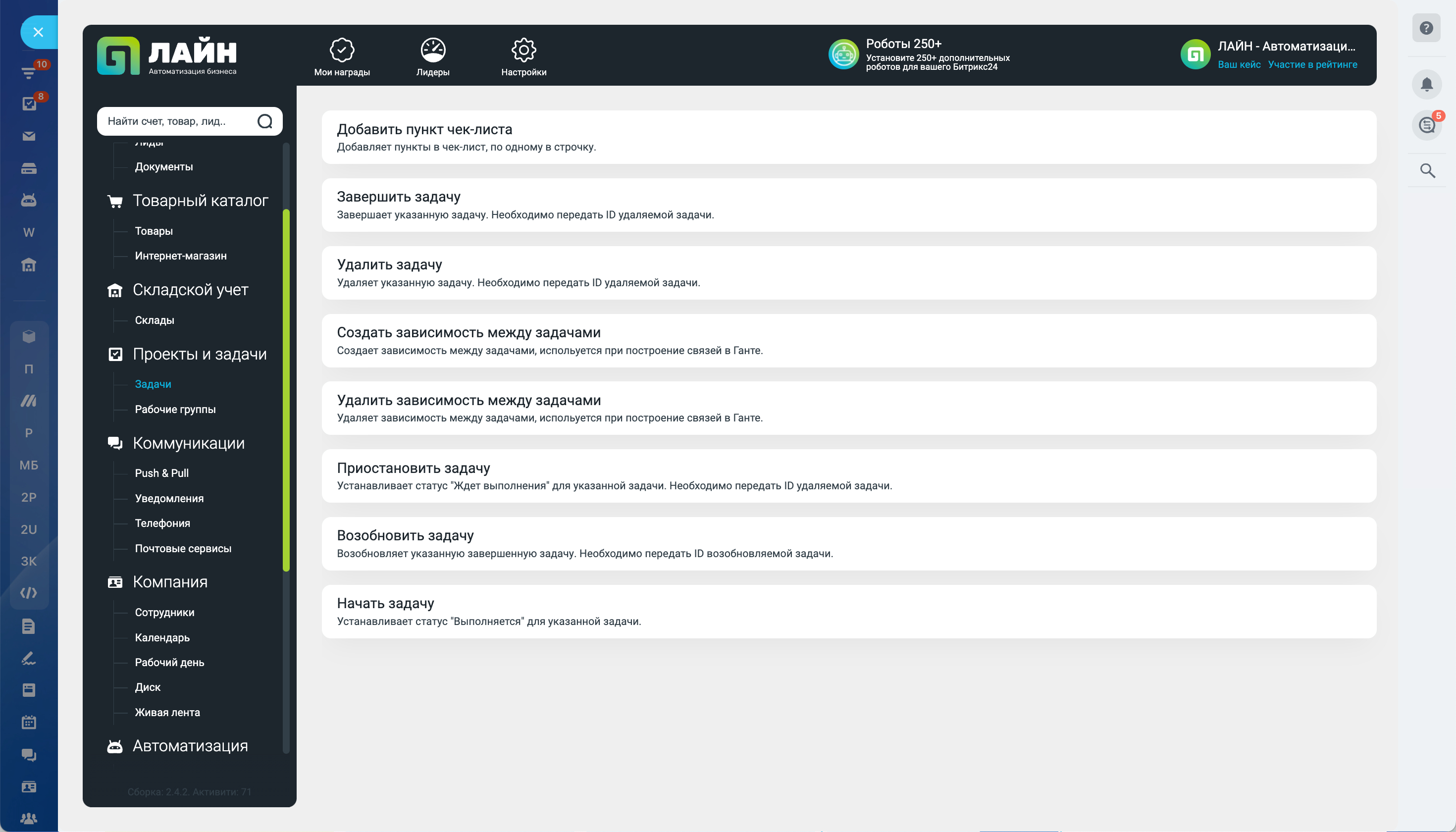 Мастер бизнес-процессов добавляет дополнительные действия в конструктор бизнес-процессов Битрикс24. Дополнительные действия позволяют расширить автоматическую работу со счетами, документами, элементами CRM, задачами, создавать и запускать обратные звонки, инфо и аудио звонки клиентам, работать с задачами и проектами, отправлять уведомления в мобильное приложение Битрикс24 и многое другое.