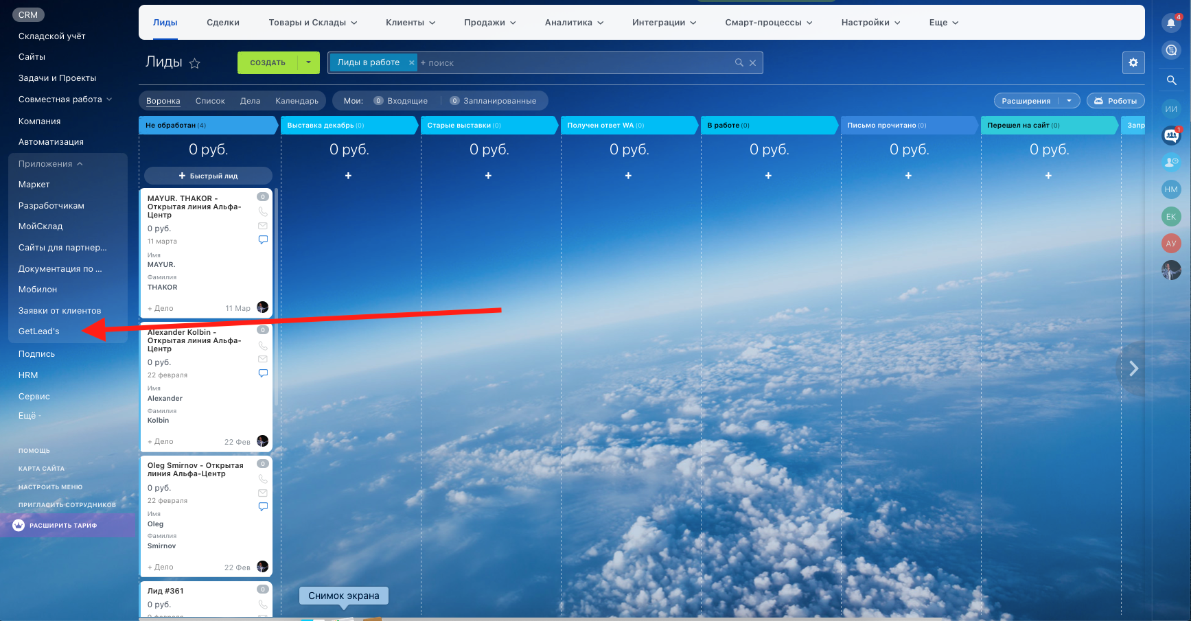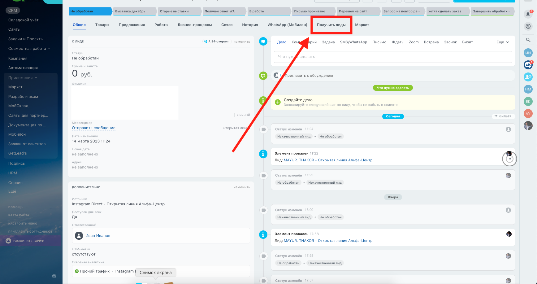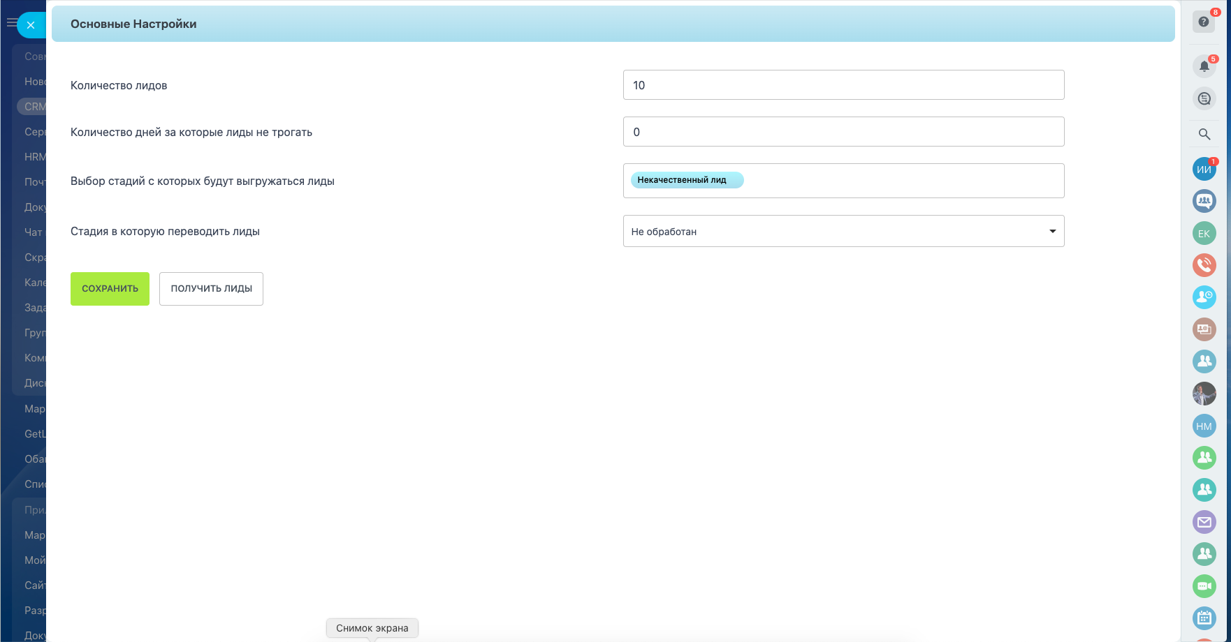 Приложение "Get lead's" позволяет по клику на кнопку передать "Некачественные" Лиды с определенных стадий провала менеджеру на повторную проработку