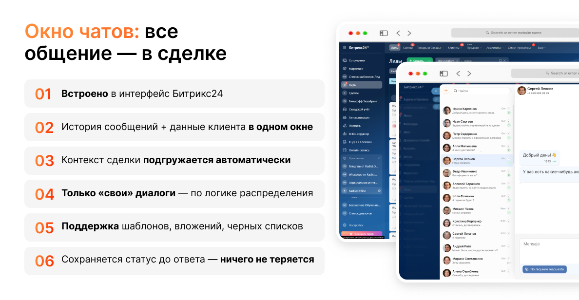 Открывайте Окно чатов через левую панель или прямо из карточки — и сразу видите активные диалоги, статус, название сделки и контактные данные. Встроенный интерфейс ускоряет работу и исключает путаницу.