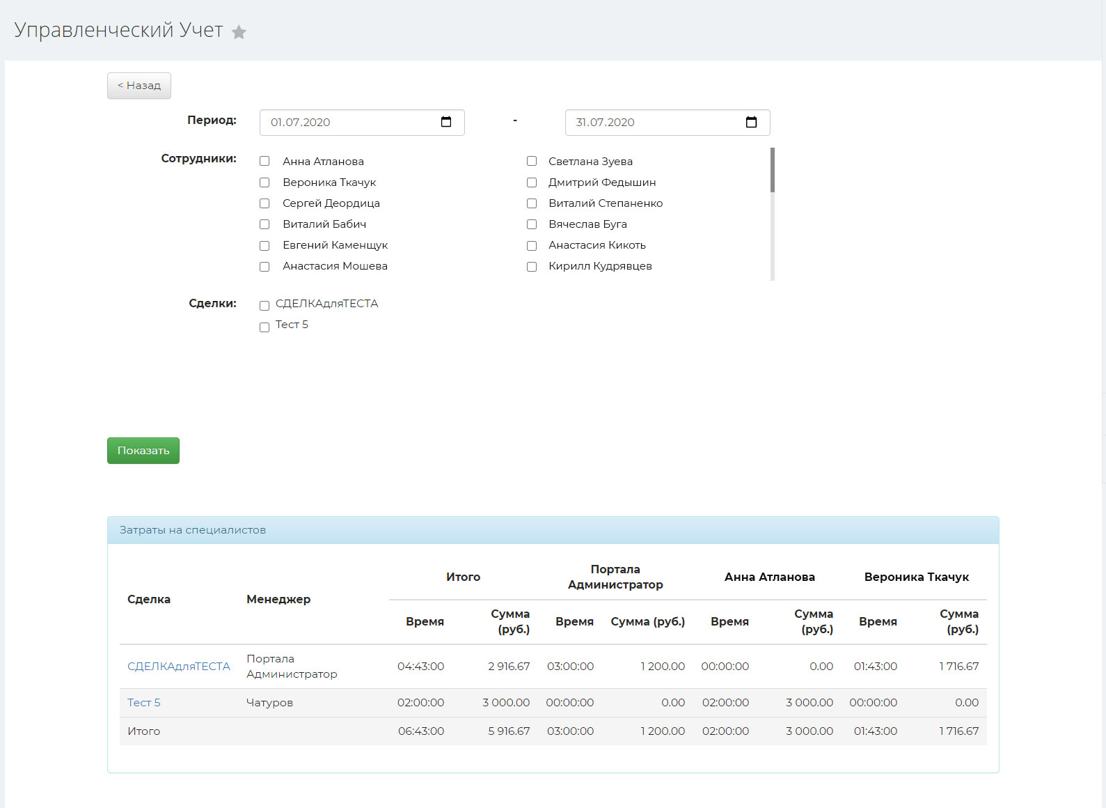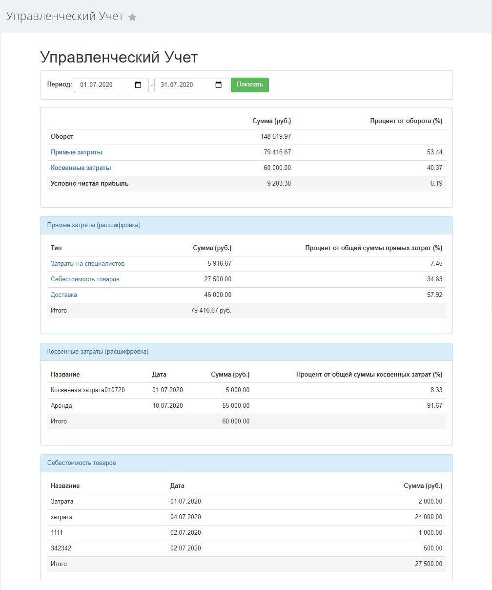 Система управленческого учета включает в себя расчет следующих показателей по всем сделкам за выбранный период: