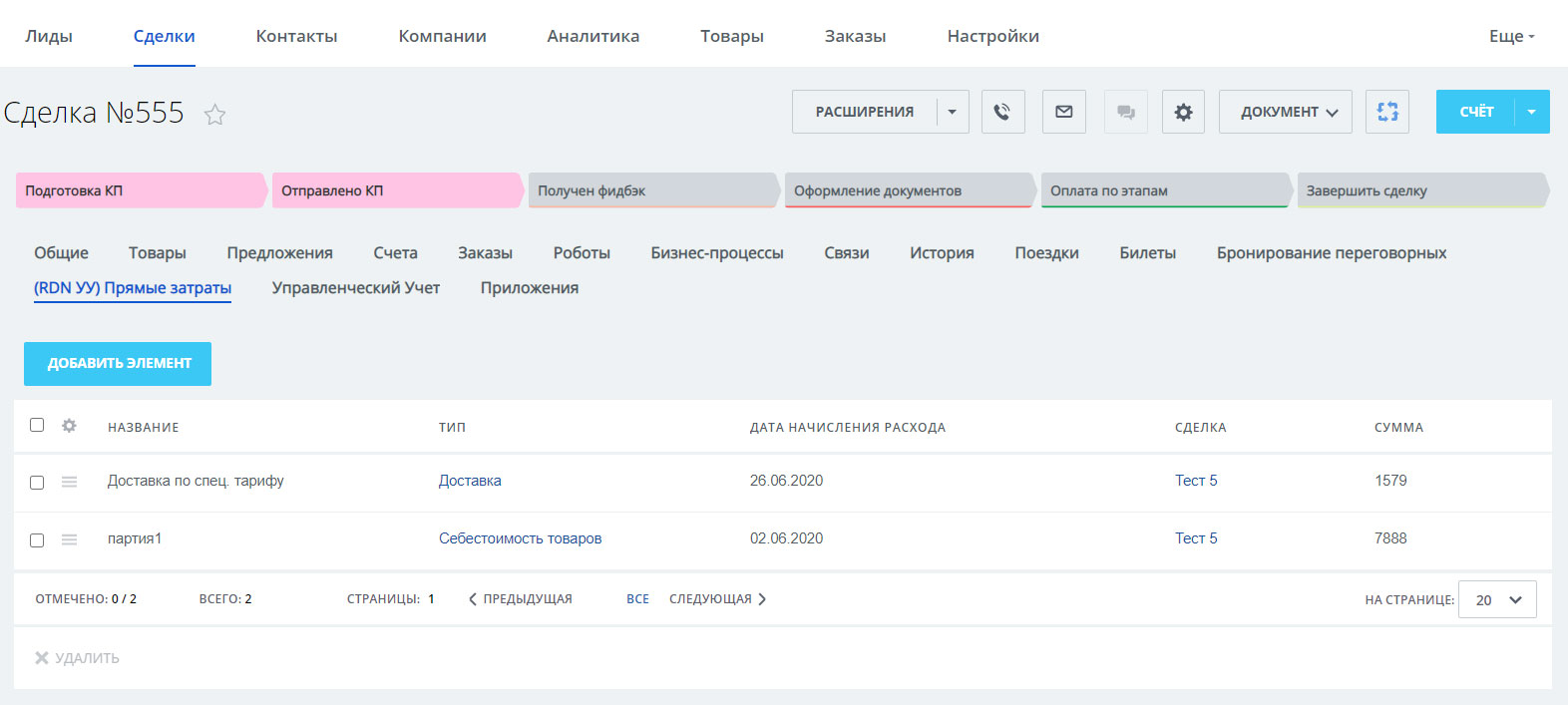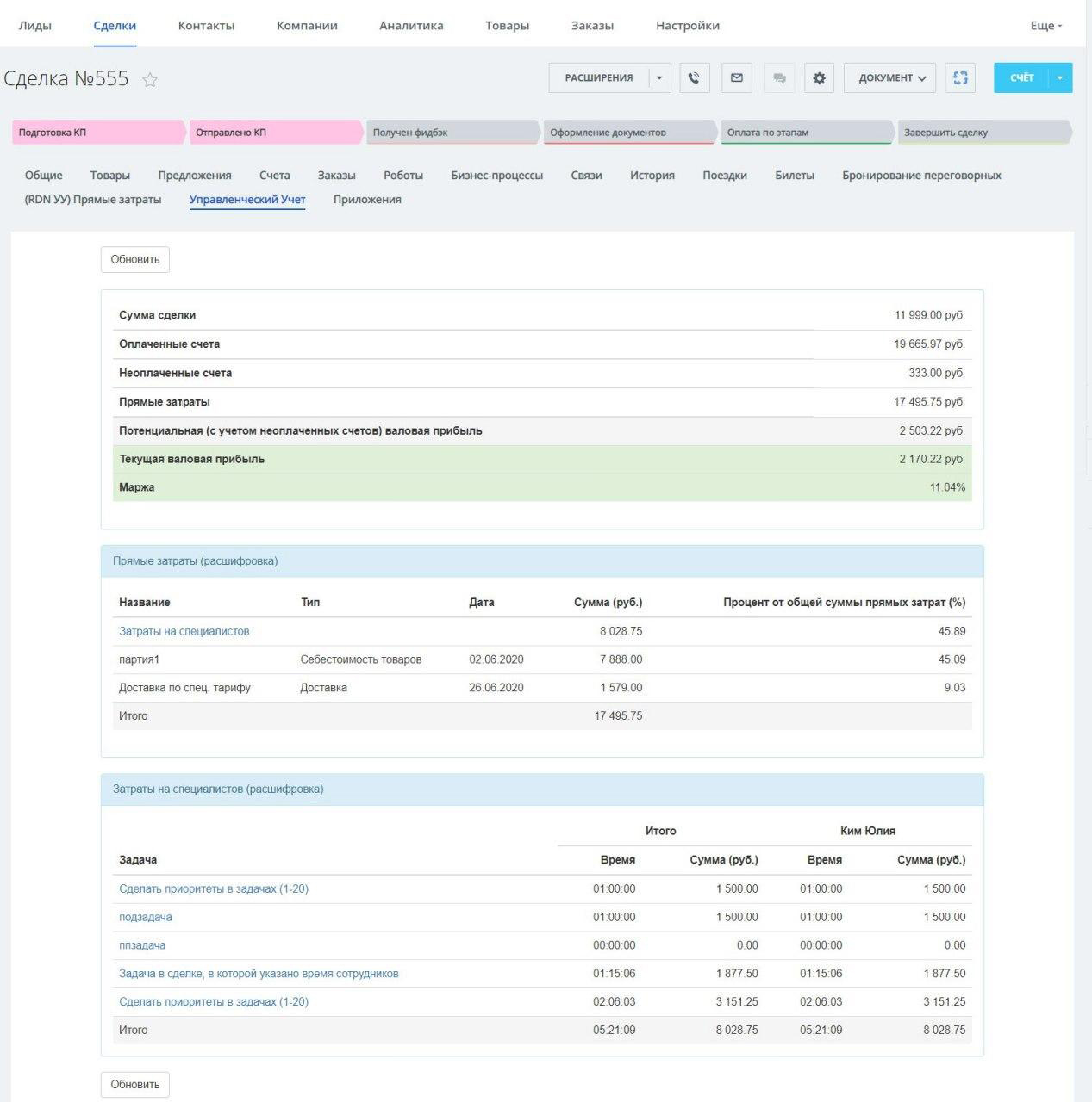 В карточке сделки показывается вкладка с финансовыми показателями по ней: