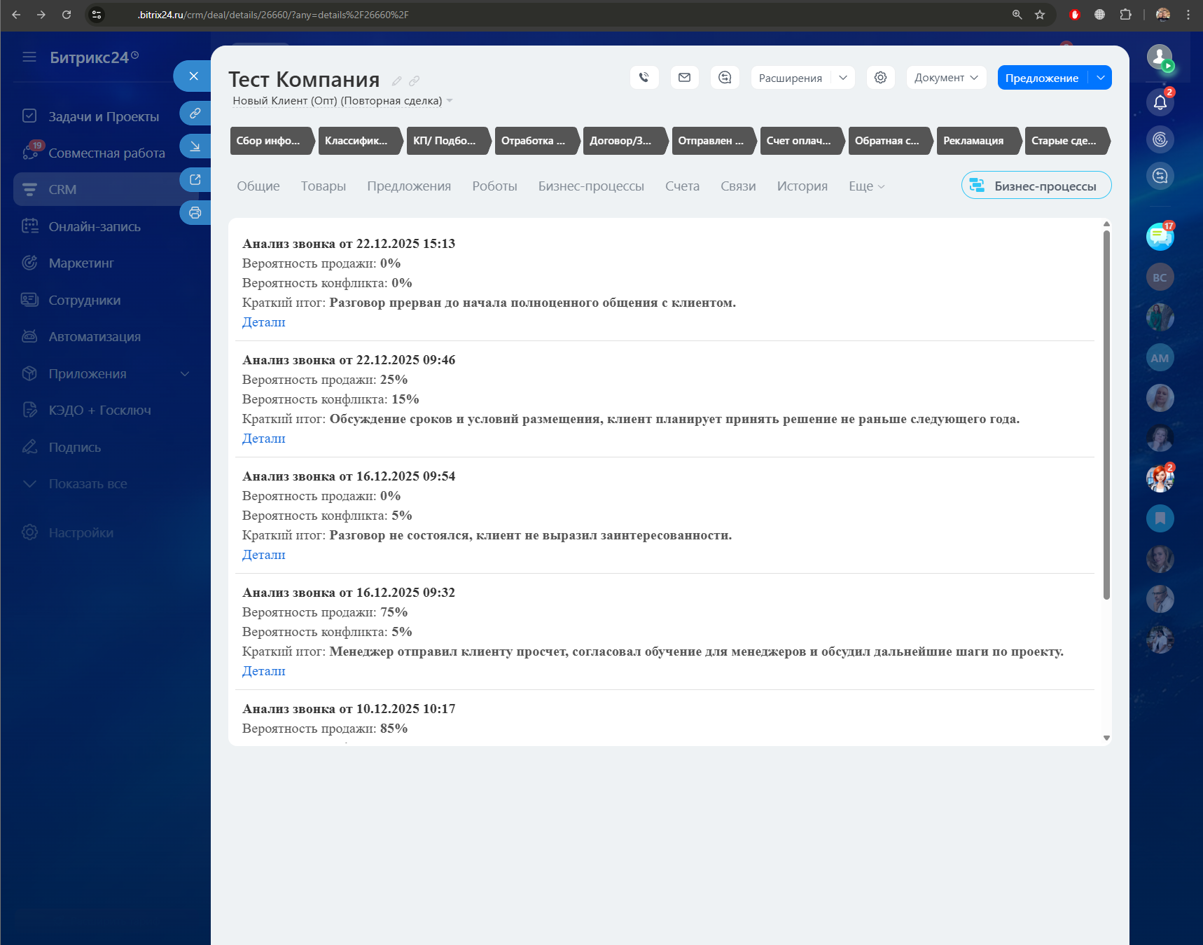 Она снимает рутину с руководителя, помогает быстро разбираться в ошибках менеджеров и дает прозрачную картину по каждому звонку, каждому сотруднику и всему отделу в целом. Сервис работает полностью автоматически: забирает звонки, переводит в текст, формирует отчёты и отправляет готовые рекомендации. Руководителю остается только принимать управленческие решения — система покажет, где теряются деньги и что нужно исправить, чтобы увеличить конверсию и выручку. Аналитика может работать как с новыми звонками, так и со старыми, которые были сделаны до установки виджета.