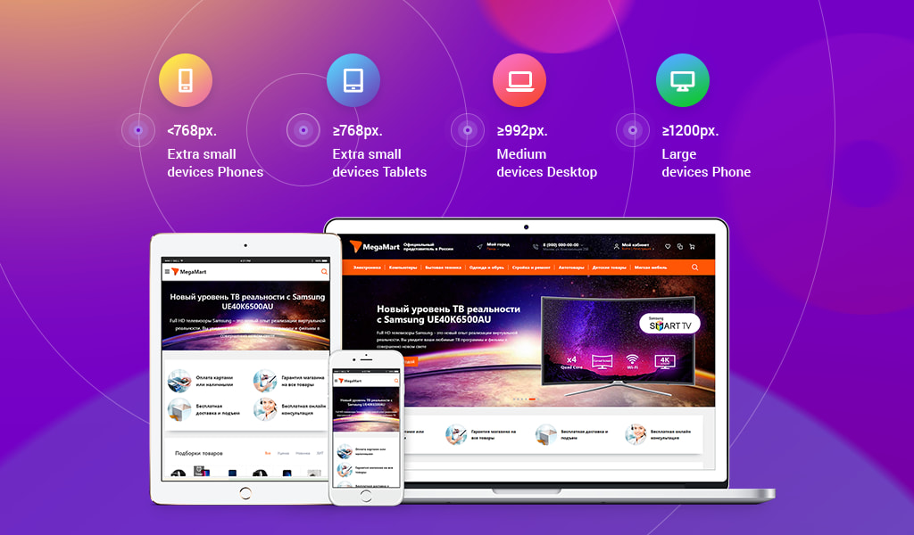 Магазин создан на базе популярного интернет-магазина для платформы 1С-Битрикс – Megamart и подойдет для товаров любой тематики.