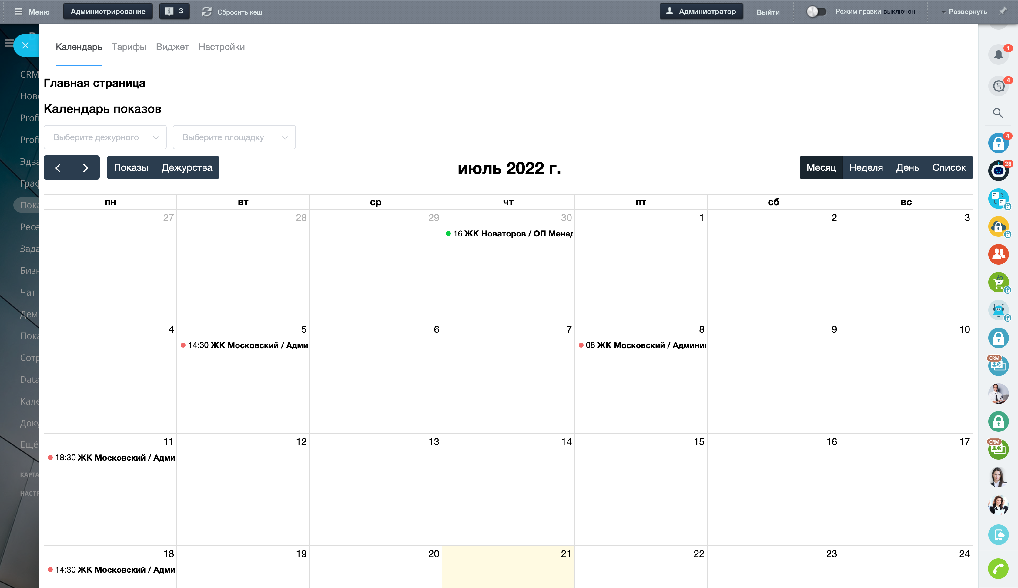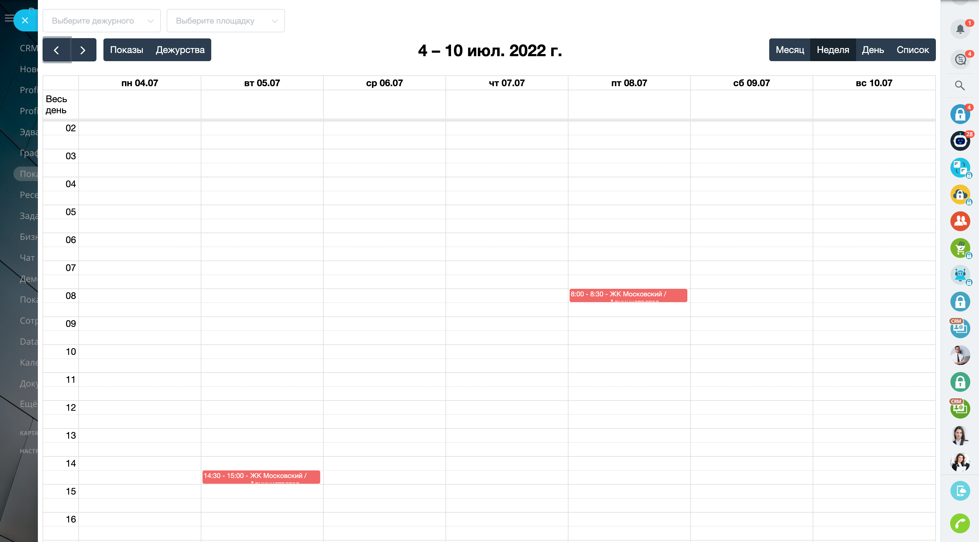 “Показы” помогают планировать встречи с клиентами с учетом графика дежурств на объектах, занятости сотрудников. Дополнительно можно настроить запись на встречу через ваш сайт с помощью нашего виджета.