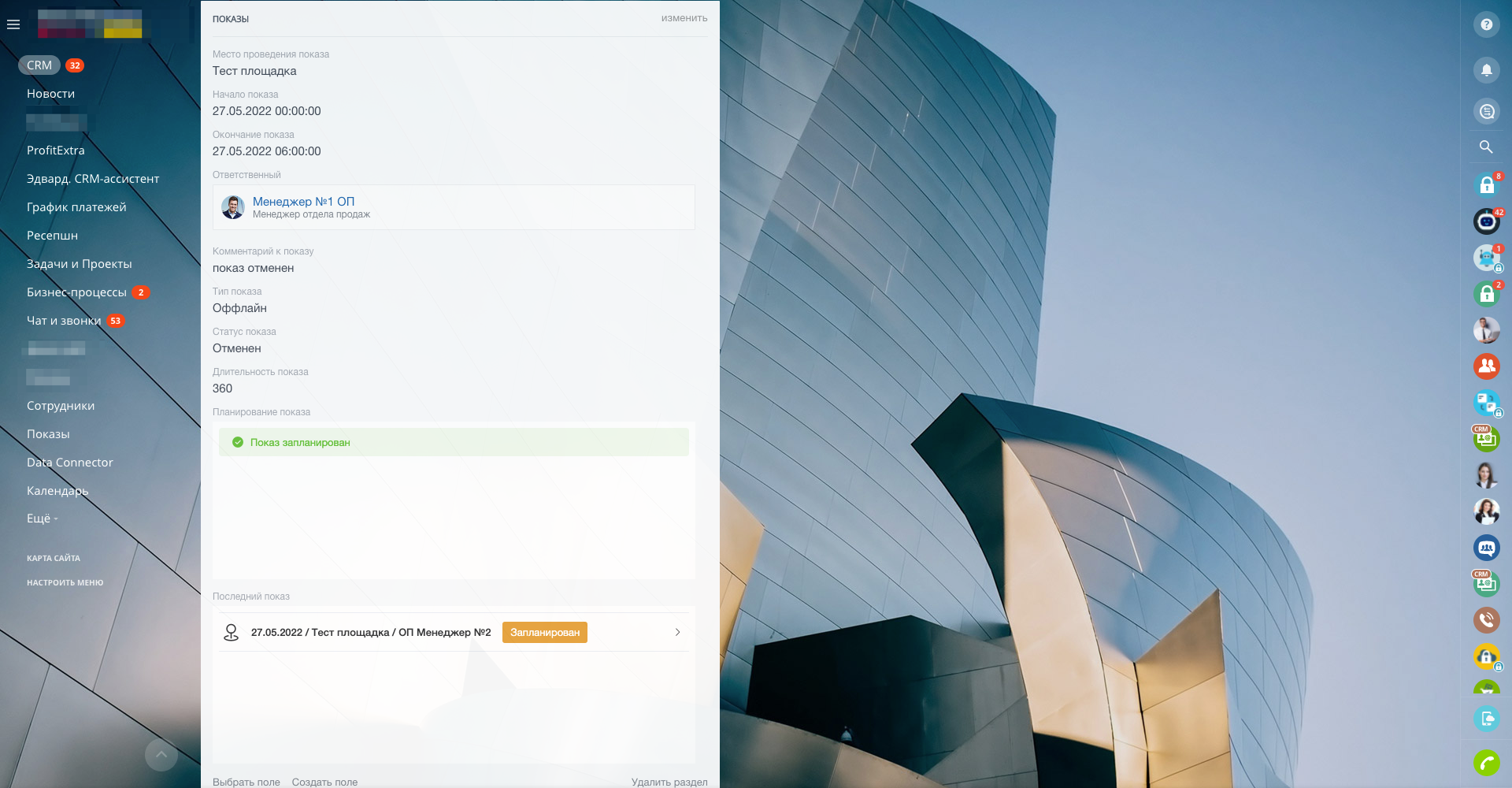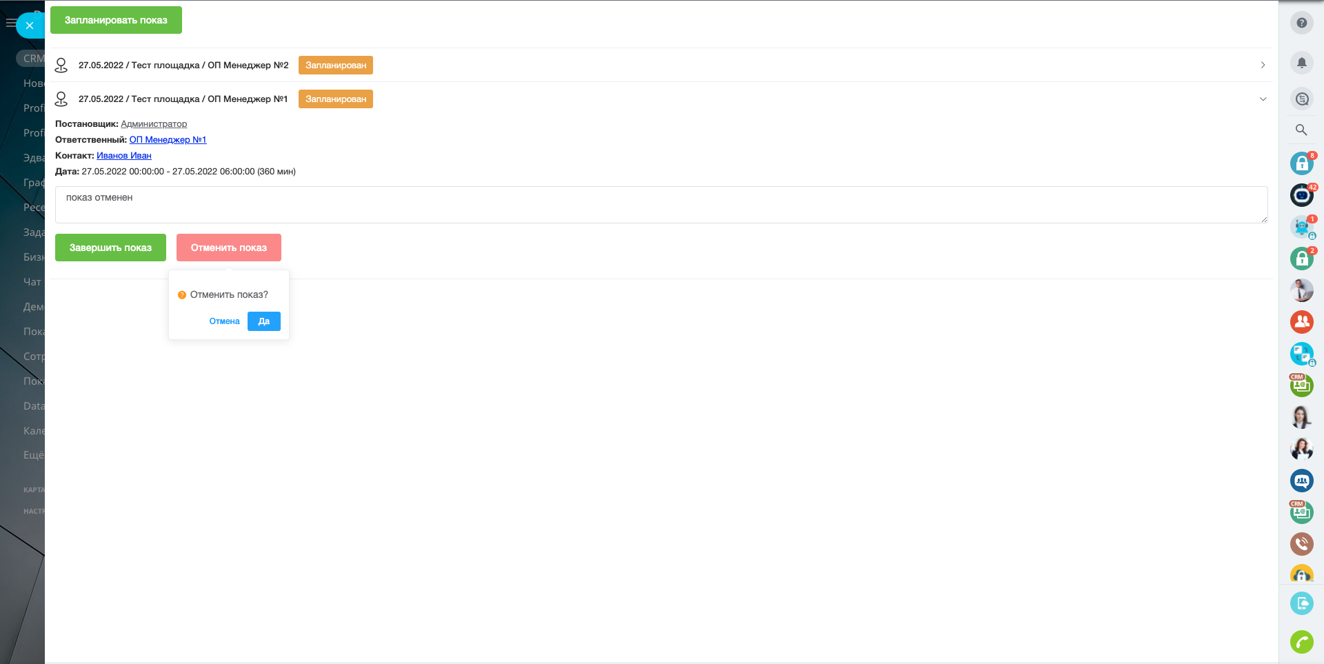 История показов отображается в таймлайне лида или сделки: назначенные, проведенные и отменные.