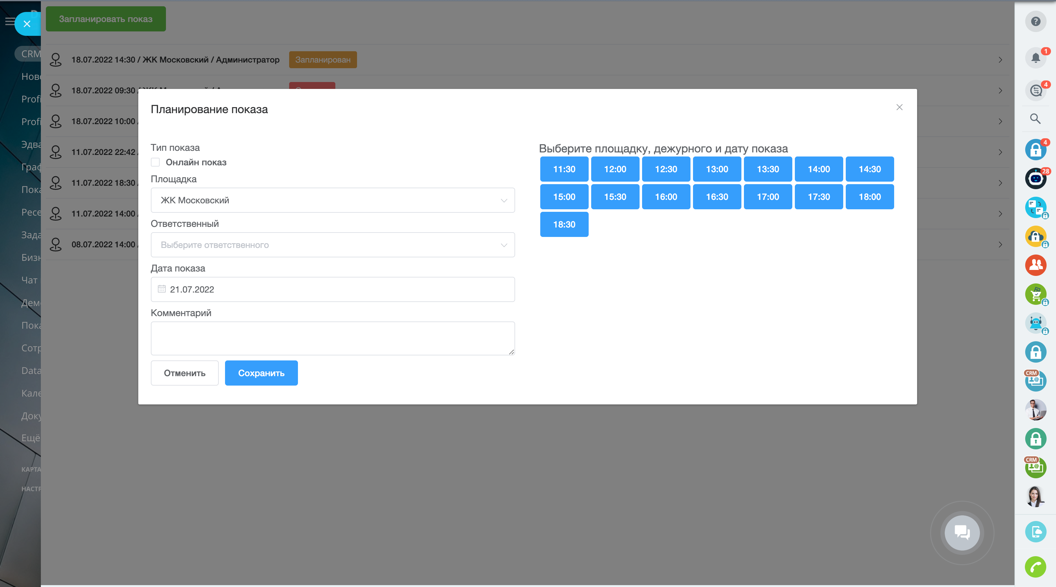 - В лиде или сделке выберите объект, дежурного и забронируйте время.