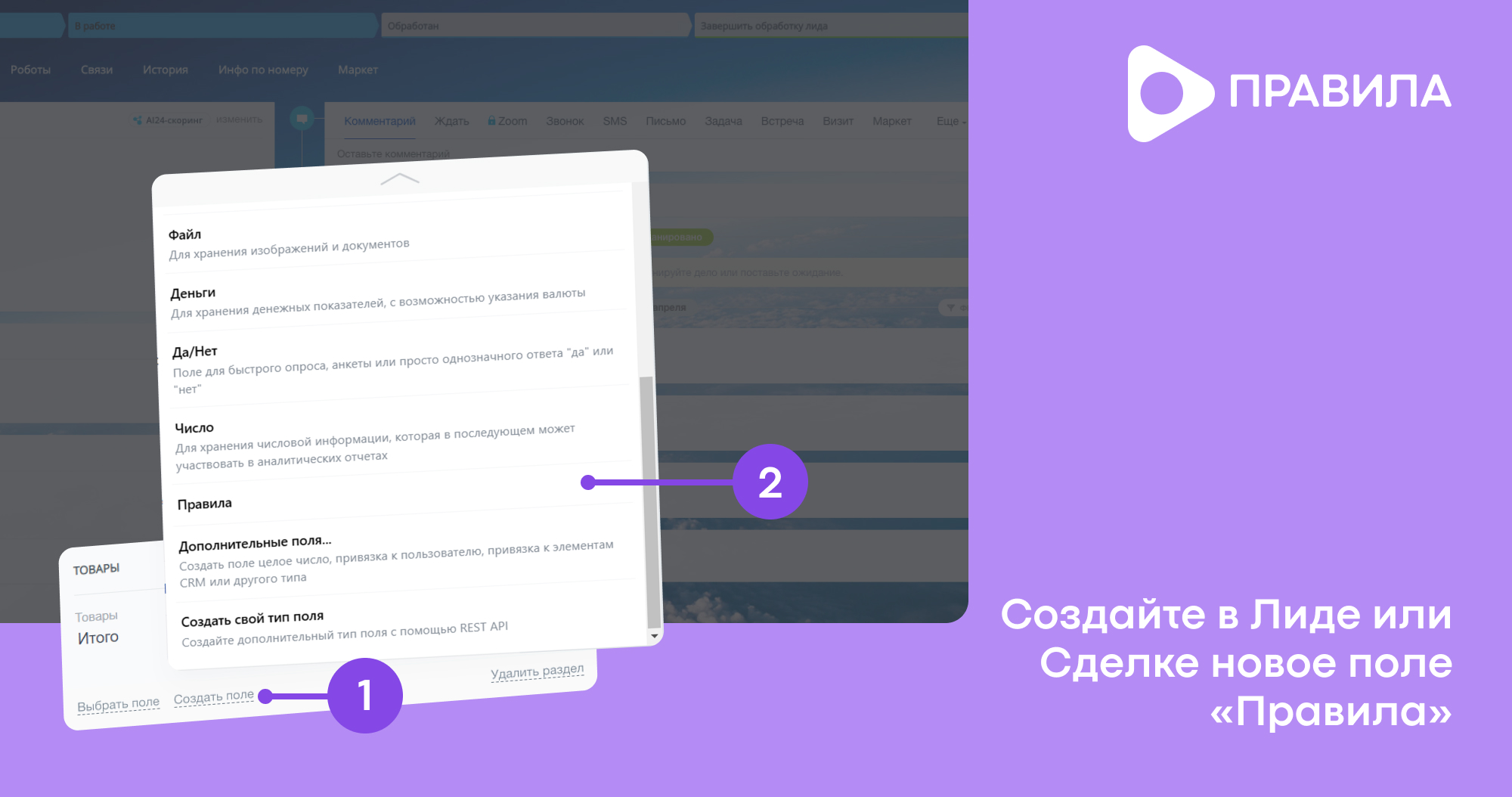 2. Создайте новое поле в карточке сущности с типом "Правило";