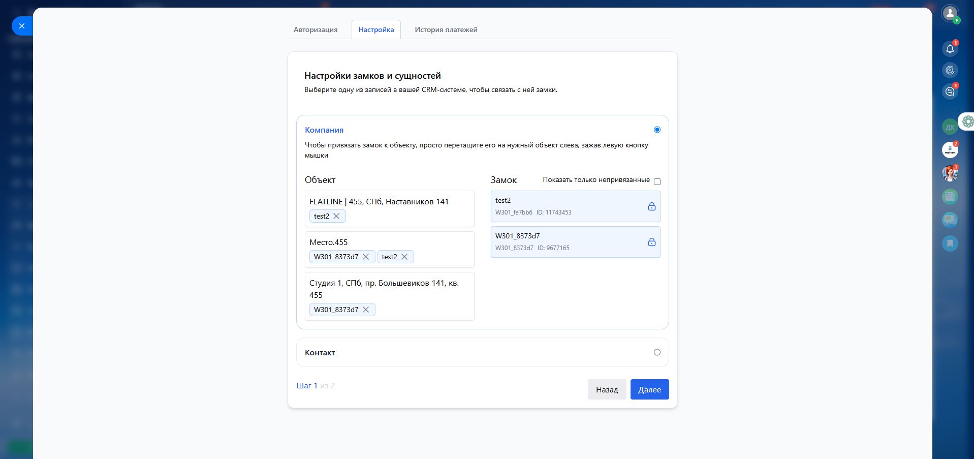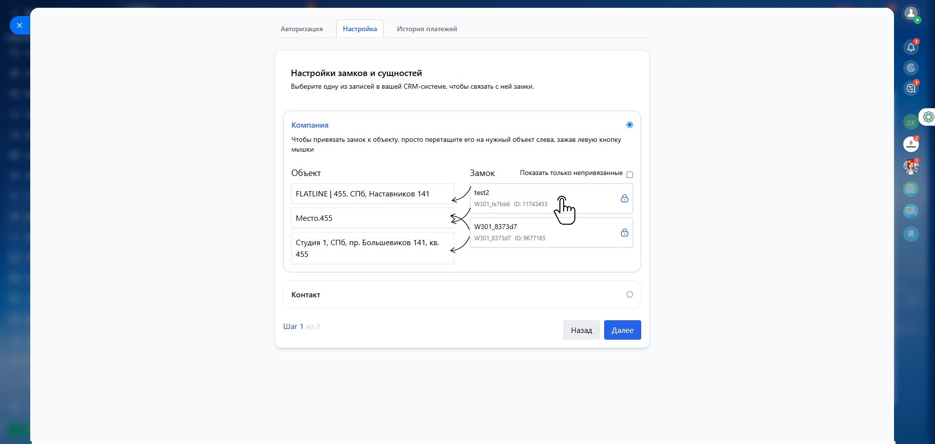 3️⃣ В появившемся окне справа будут отображены все замки, а слева — список ваших объектов в CRM.