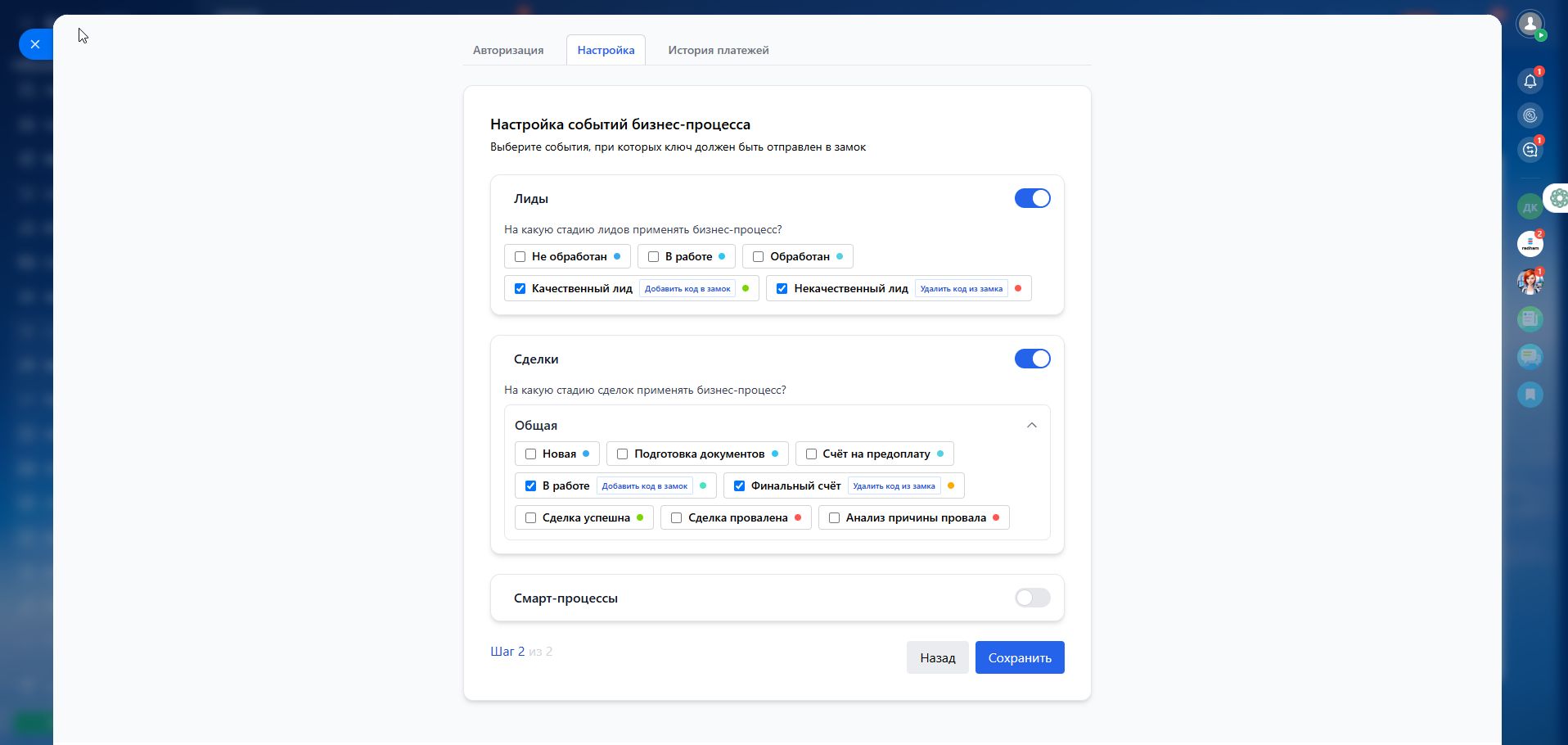 2️⃣ Выберите этапы воронки где код будет записываться в замок или удаляться.
