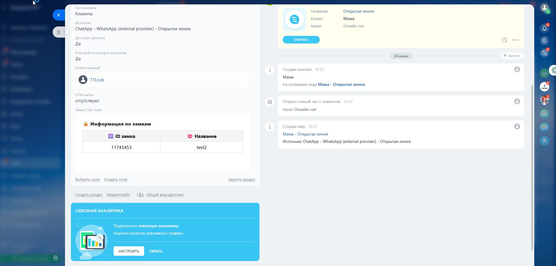 При сохранении привязки замков к объектам, в карточке соответствующей сущности (Контакт или Компания) автоматически создаётся специальное техническое поле — «Замки. тех. поле». В это поле будет записана информация о всех замках, связанных с данным объектом.