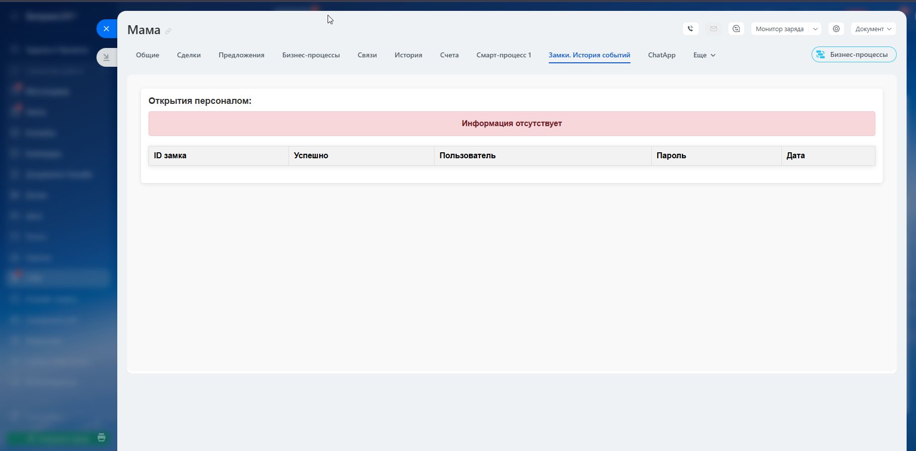 При добавлении или удалении кода из замка, в карточке Лида, Сделки или Смарт-процесса автоматически создаётся специальное техническое поле —