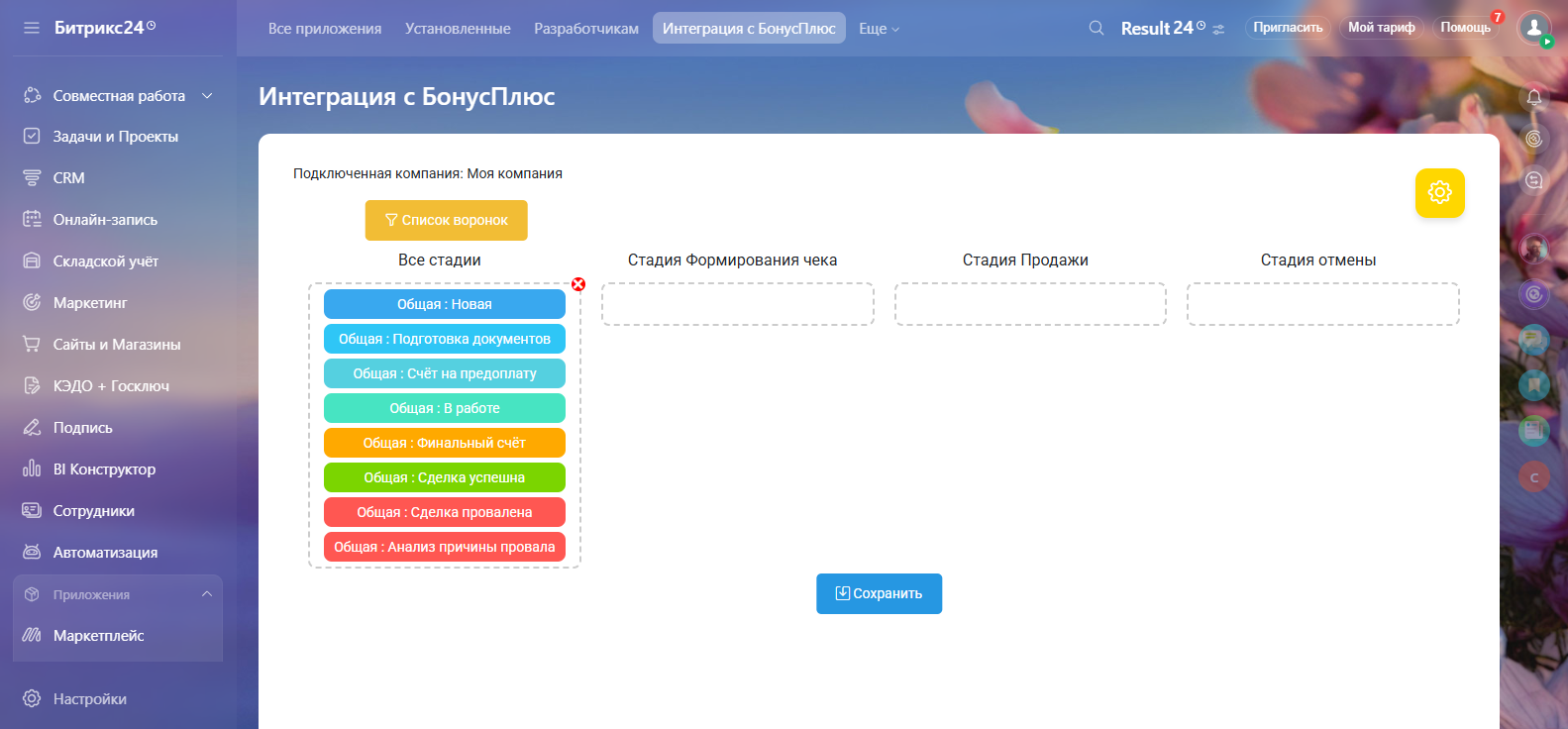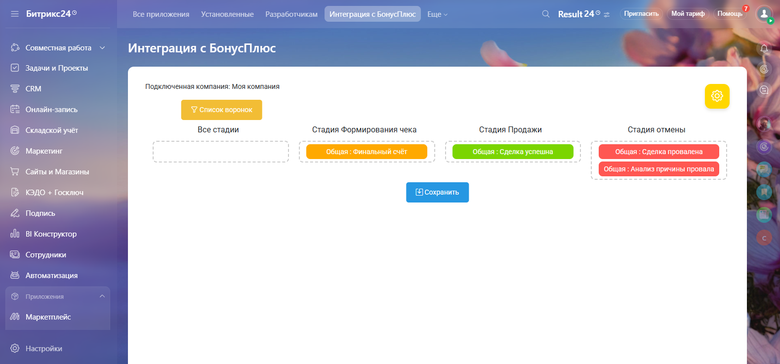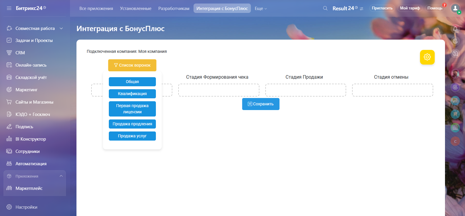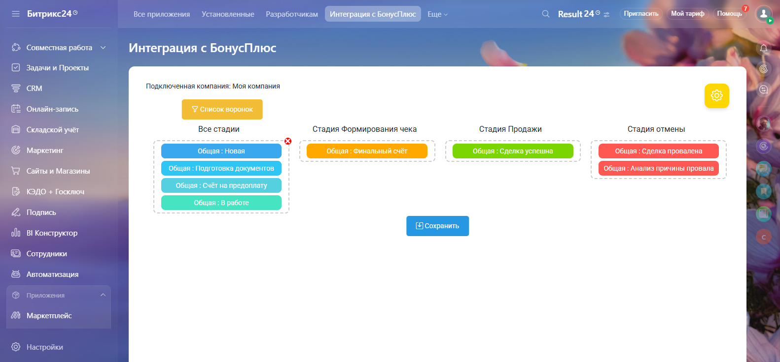 Интеграция не требует создание отдельных сущностей или воронок и легко адаптируется под ранее созданные вами процессы. Вам не нужно нагружать вашу систему дополнительными объектами. Просто выберите вашу рабочую воронку и распределите стадии, на которых ВЫ хотите производить списание и начисление бонусов Вашим клиентам.