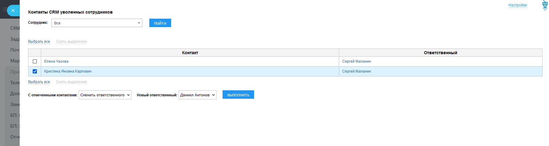 Приложение позволяет увидеть контакты уволенных сотрудников одним списком, а также настроить смену ответственного за контакт при увольнении сотрудника.