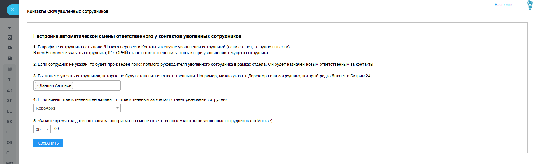 - Настроить ежедневную смену ответственного у контактов при увольнении сотрудника.