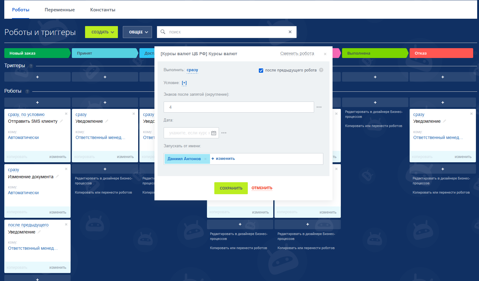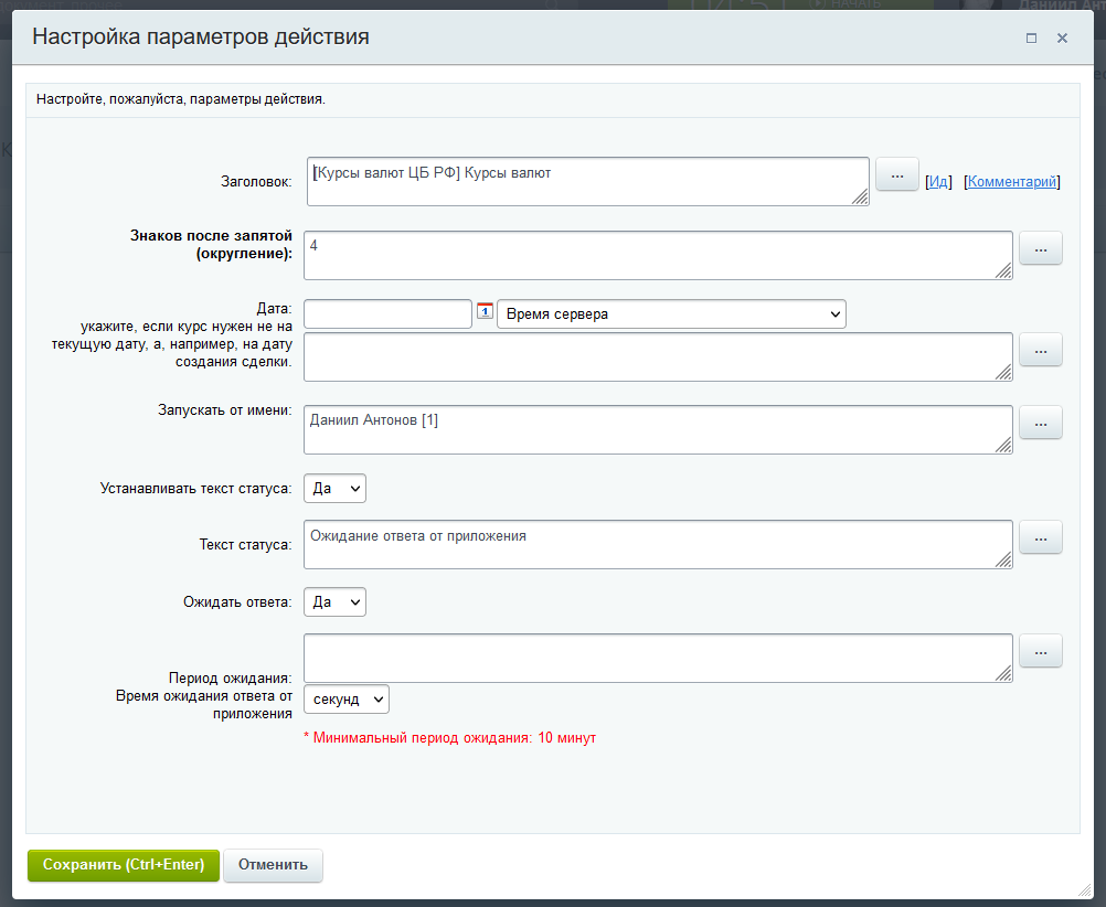 - указать дату, на которую нужен курс обмена, например, если нужно узнать, какой курс был на дату создания сделки. По умолчанию курс обмена берется на дату выполнения активити.