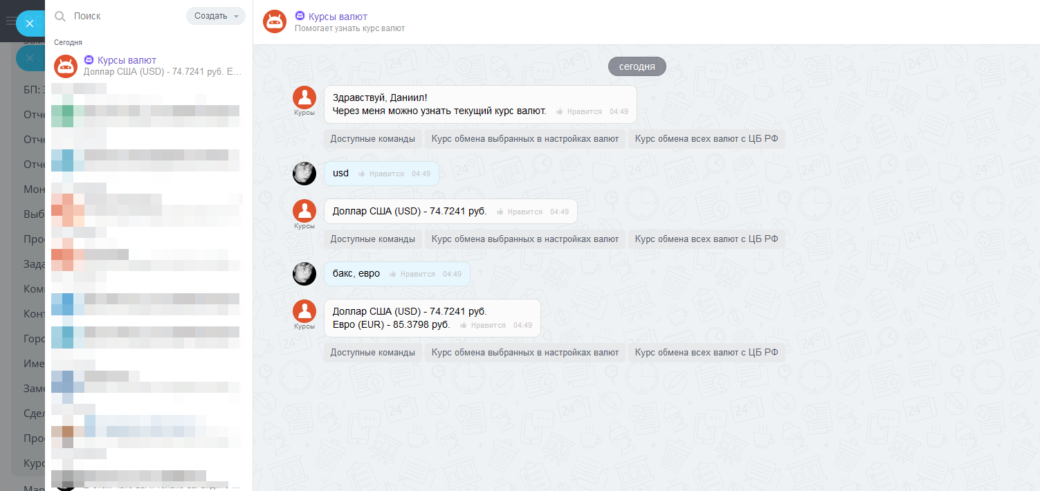 После установки приложения у вас появится чат-бот "Курсы валют", доступный для всех сотрудников.