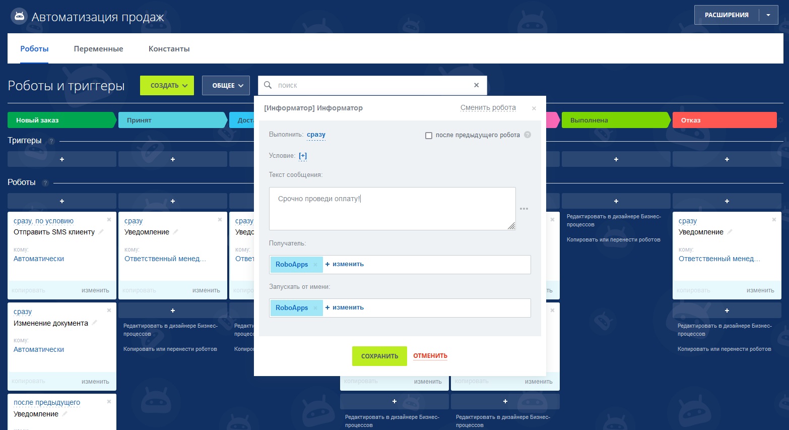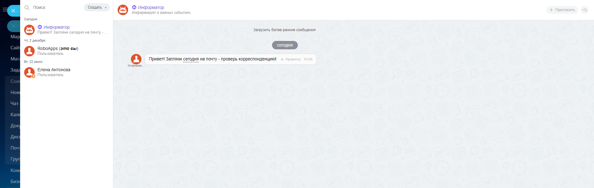 Благодаря ему, вы сможете отправлять через робота или бизнес-процесс важные сообщения сотруднику прямо в чат, и тогда он точно обратит на них внимание.