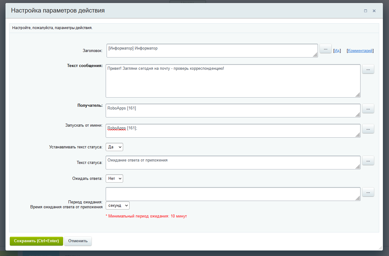 - В роботе или в активити бизнес-процесса "Информатор" укажите текст сообщения и его получателя.