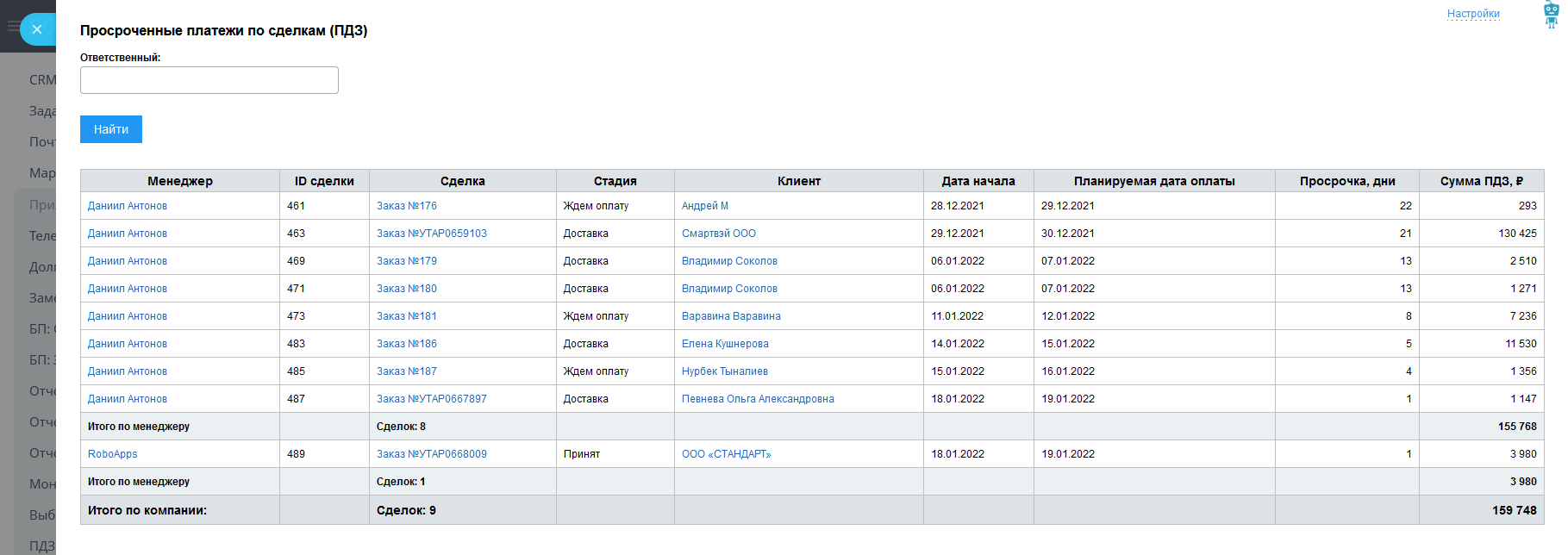 Приложение позволяет увидеть сделки менеджеров с просроченной оплатой (ПДЗ).