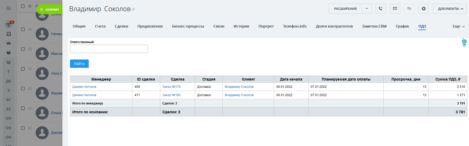 Приложение встраивается в карточку компании и контакта. Таким образом, прямо из карточки вы можете увидеть текущее состояние по ПДЗ с данным контрагентом по всем его сделкам и менеджерам.