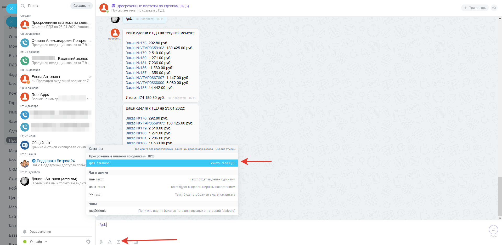 Чат-бот может формировать список сделок с ПДЗ на текущее время.