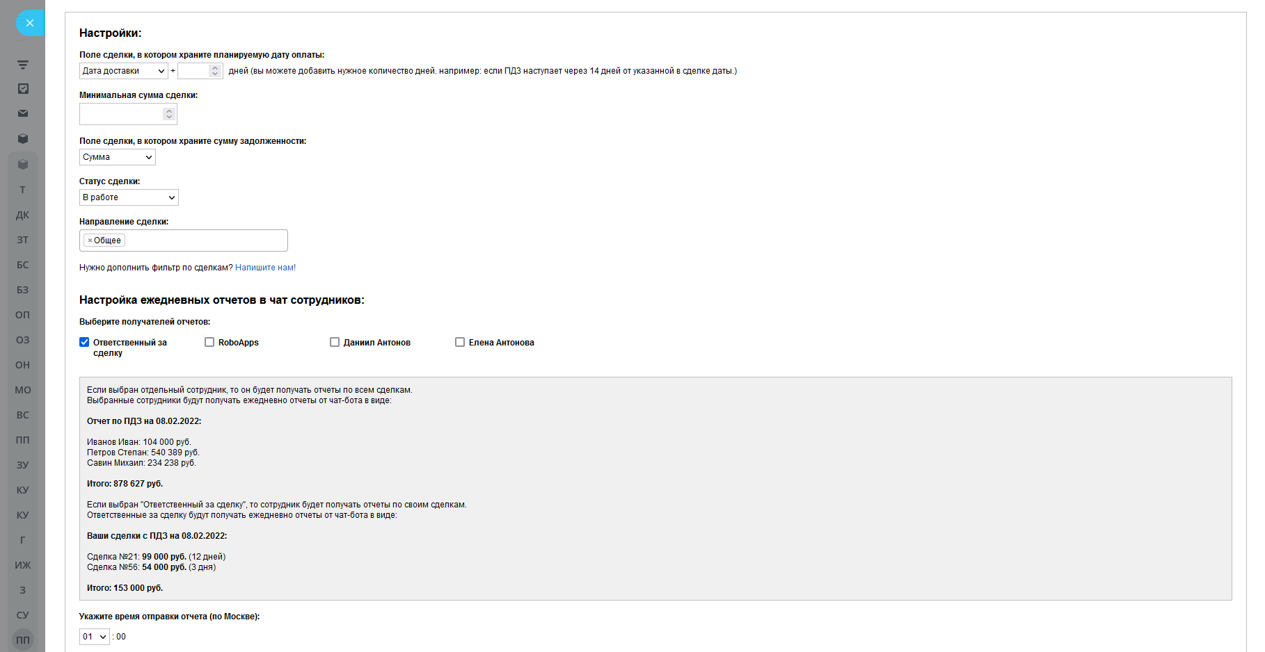 - Поле сделки, в котором храните сумму задолженности. Если вы храните в сделке сумму, которую осталось оплатить клиенту, то это поле нужно указать. Оно и будет являться суммой ПДЗ. В противном случае будет выводится сумма сделки.