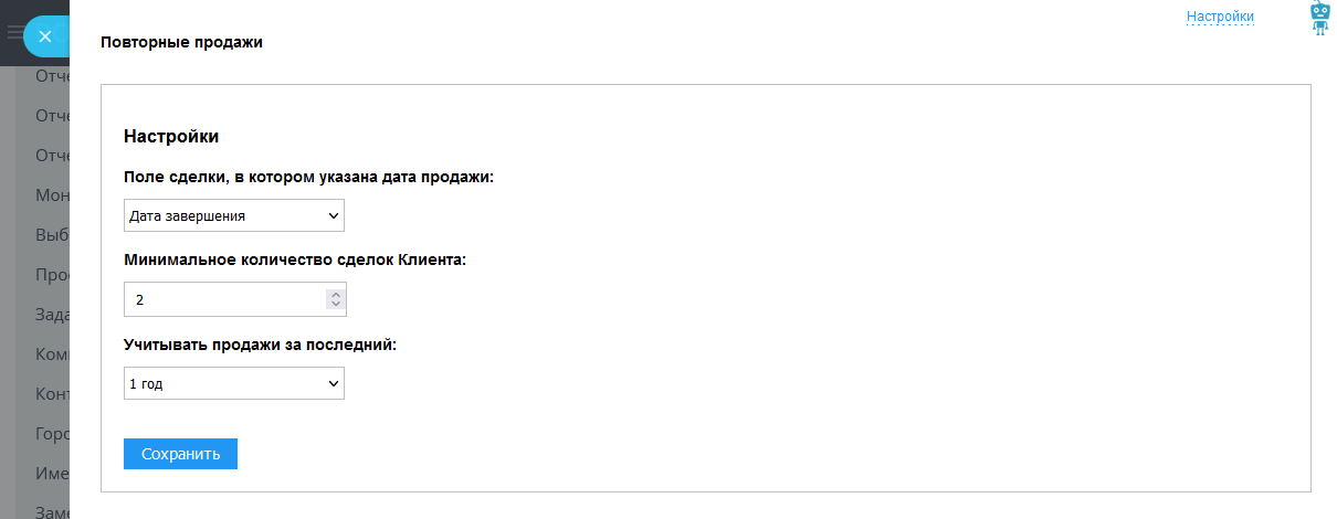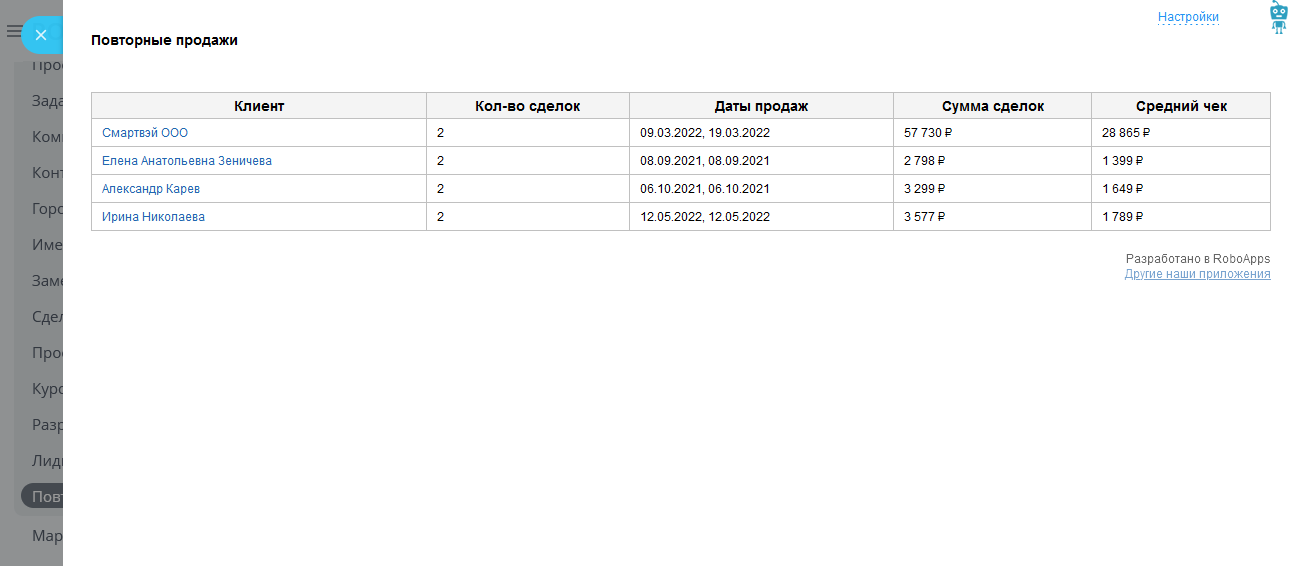 Приложение "Повторные продажи" покажет вам Ваших клиентов, у которых есть более одной успешной сделки.