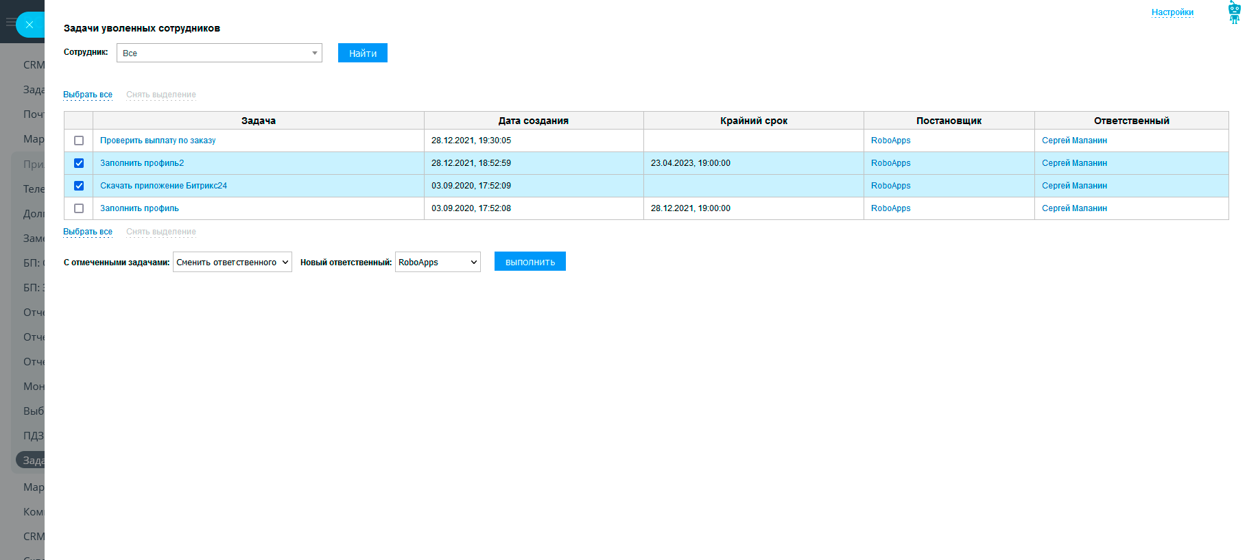 Приложение показывает задачи по уволенным сотрудникам с возможностью сменить ответственного или закрыть задачи. Есть возможность настроить автоматическую смену ответственного задачи уволенного сотрудника.