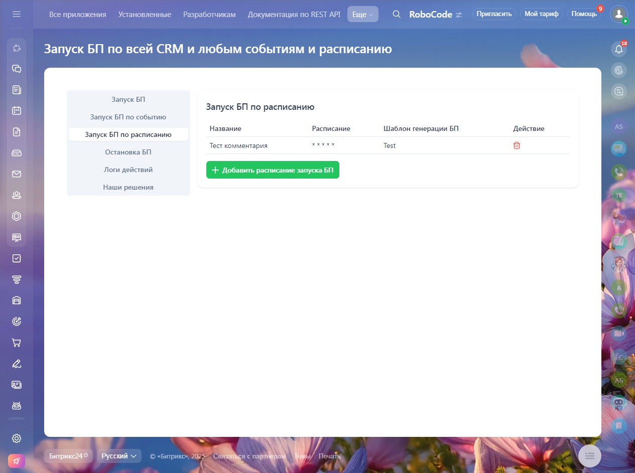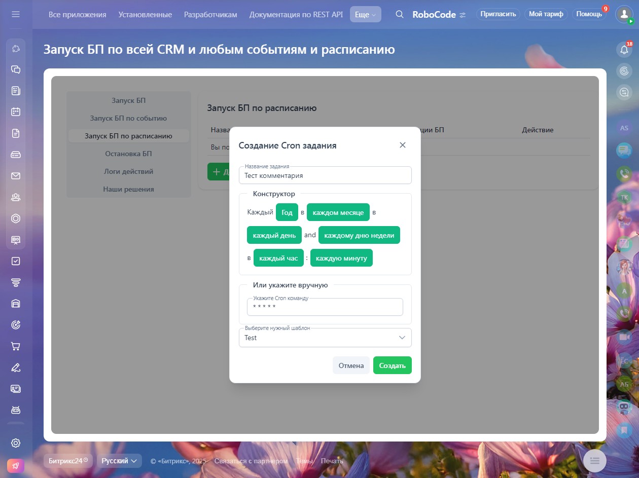 Автоматизация по расписанию: Запускайте сложные бизнес-сценарии в определенное время, день недели или с заданной периодичностью. Идеально для массовых обновлений, напоминаний и отчетности.