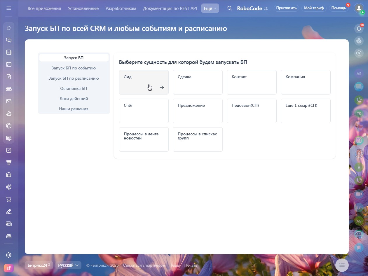 Всеобъемлющий запуск бизнес-процессов: Запускайте БП для всех ключевых сущностей CRM: Лиды, Сделки, Компании, Контакты, Счета и Предложения. А также для Смарт-процессов, элементов групп и новостей.