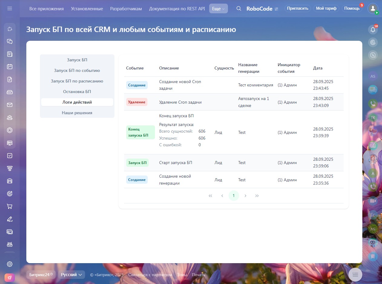 Запуск по любому событию: Реагируйте на любое действие в CRM. Изменение статуса, обновление поля, создание сущности — все это может стать триггером для автоматизации. (При необходимости, мы добавим нужные события по вашему запросу).
