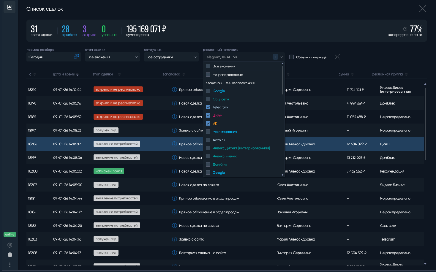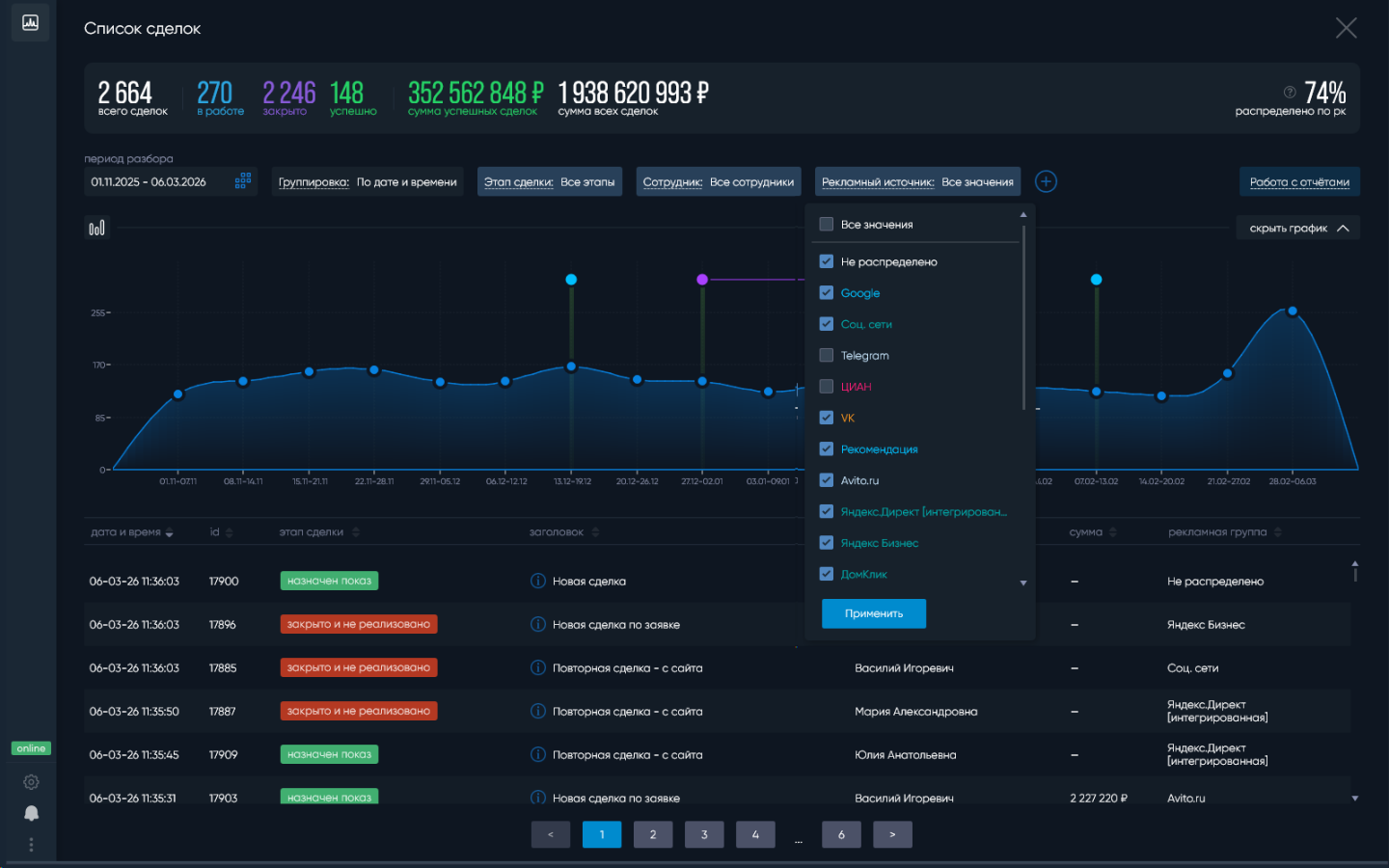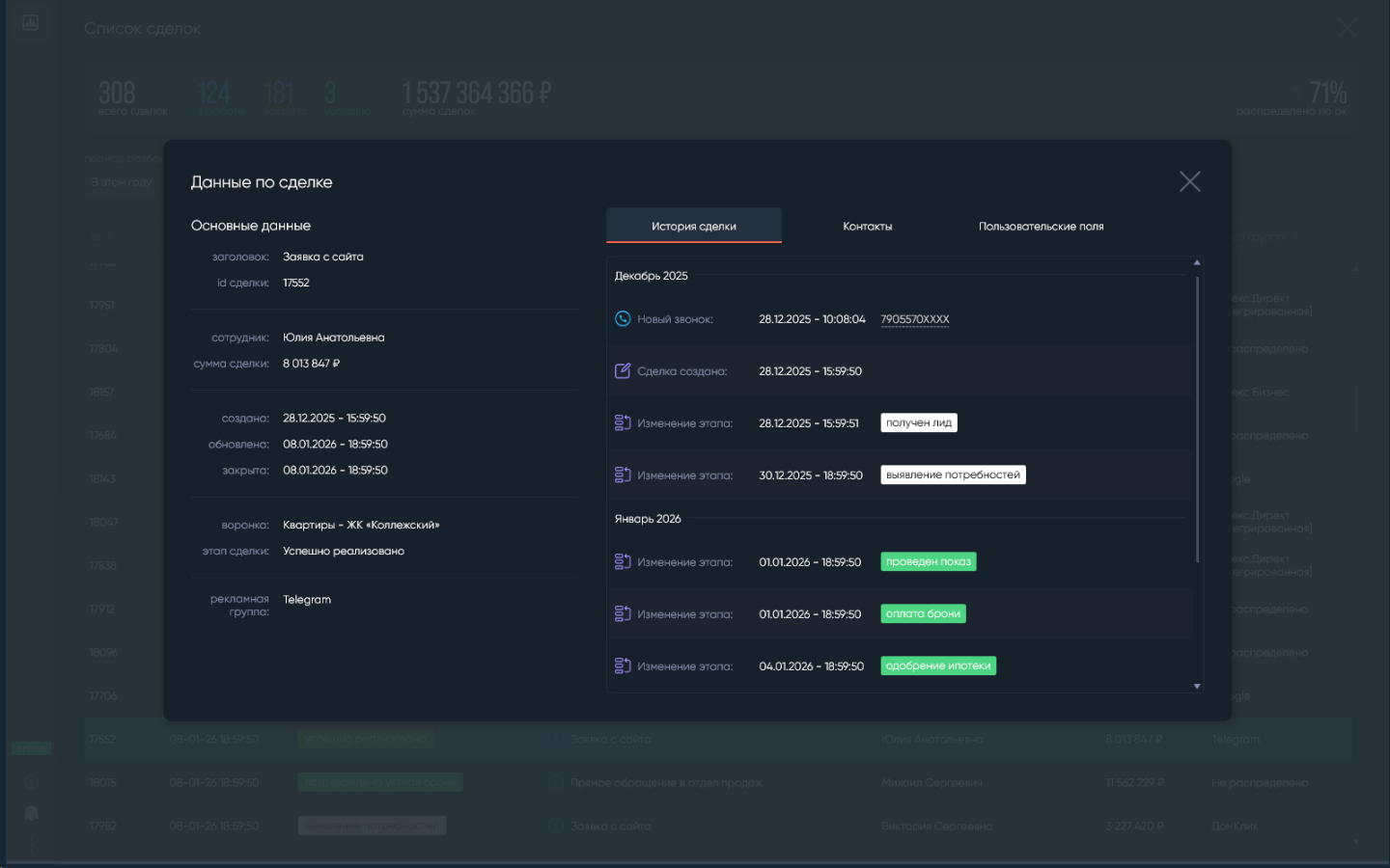 • отслеживать движение сделок и анализировать обращения в едином интерфейсе;