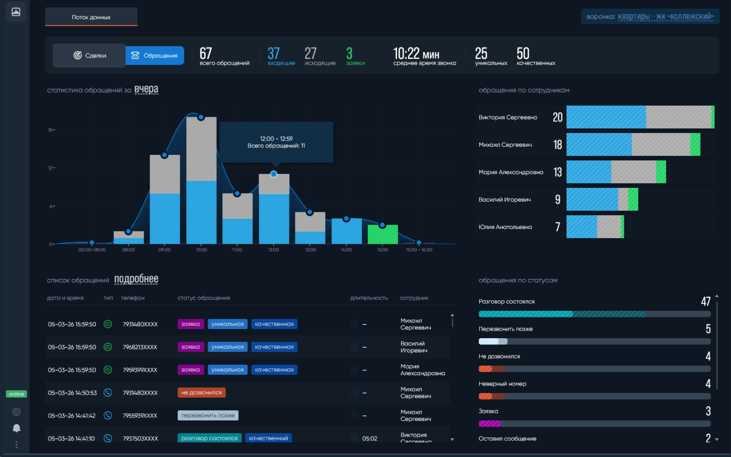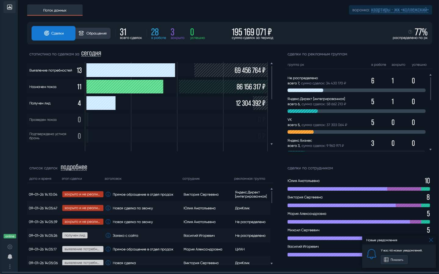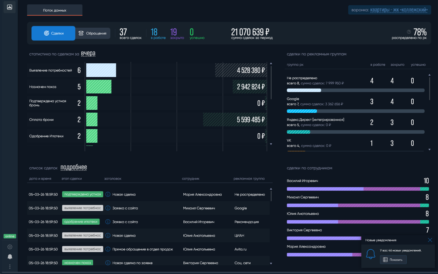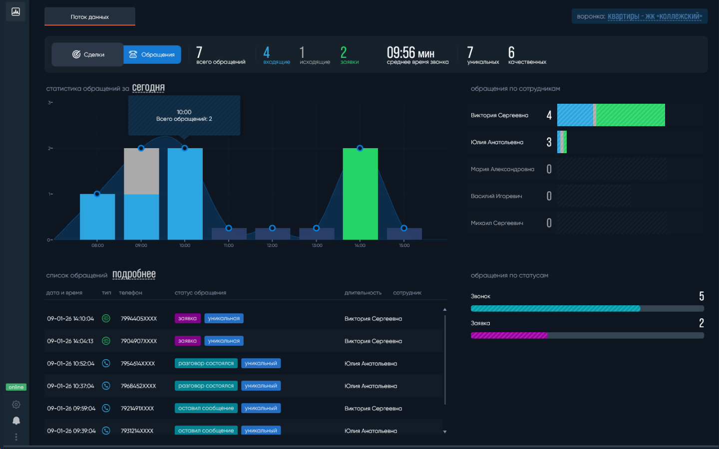 • отслеживать движение сделок и анализировать обращения в едином интерфейсе;
