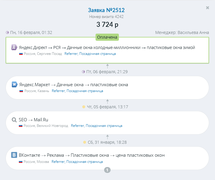 Благодаря интеграции с Битрикс24, Roistat автоматически связывает клики с рекламных источников со сделками и лидами из Битрикс24. Таким образом вы увидите, с каких ключевых слов пришли клиенты, и сколько денег и сделок в итоге принесли конкретные рекламные кампании, вплоть до ключевых слов.
